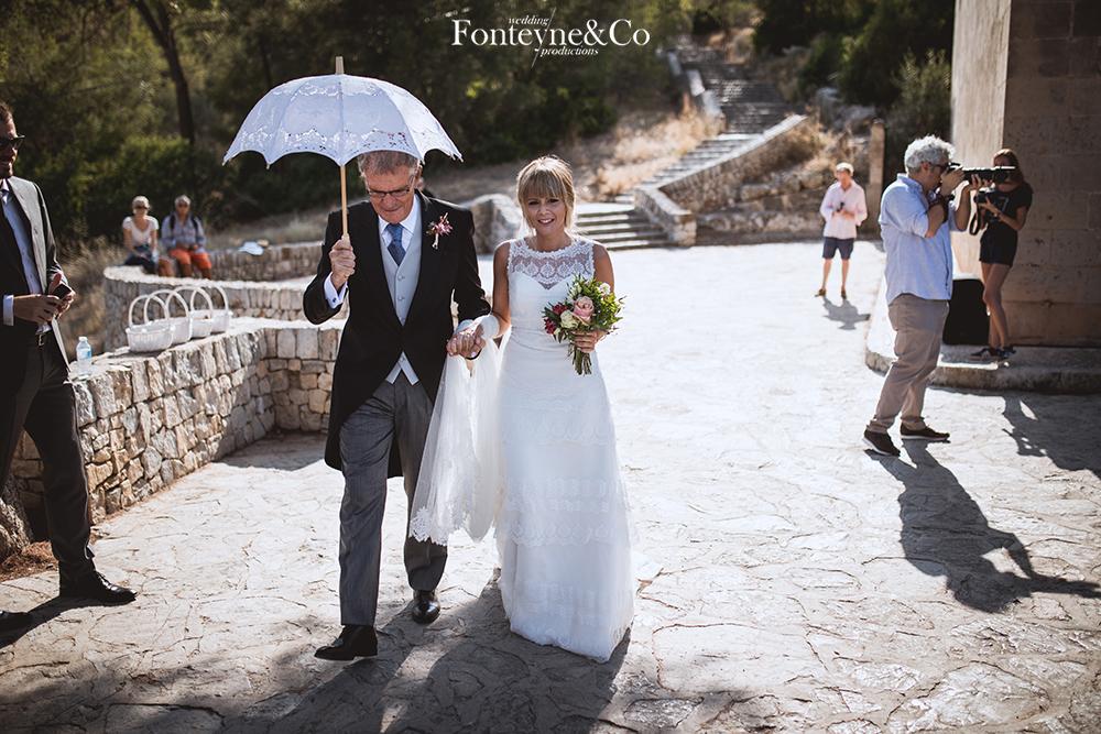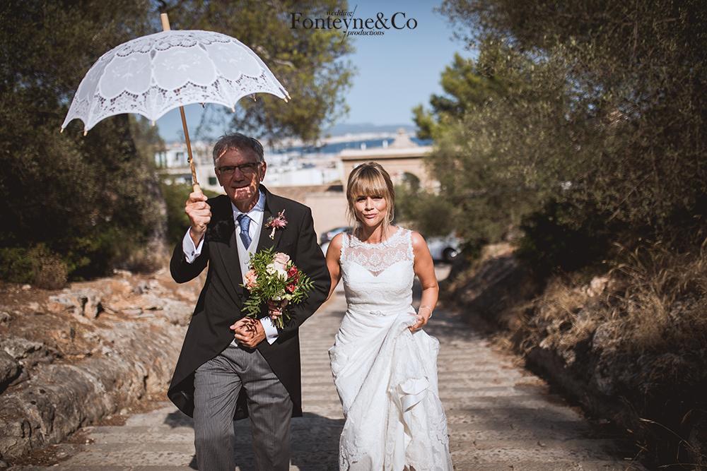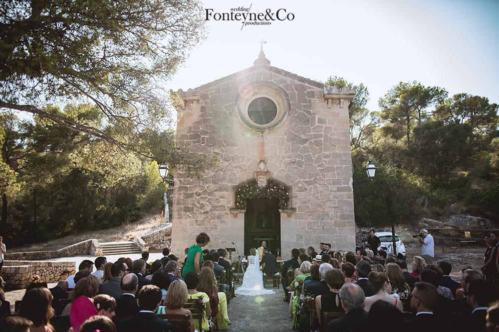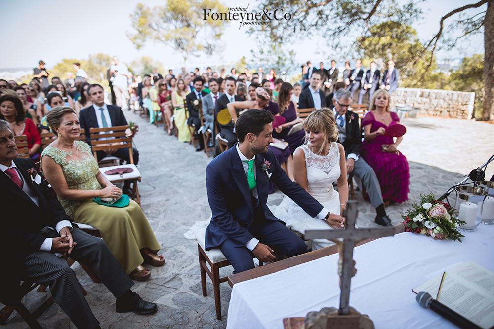 Para la boda los novios eligieron la preciosa Ermita del Castillo de Bellver, donde decoramos todo para que estuviera al gusto de la pareja. Se colocaron las sillas en frente de la ermita y pusimos flores en el marco del portón para enmarcar el momento. Ofició la ceremonia el padre Toni.