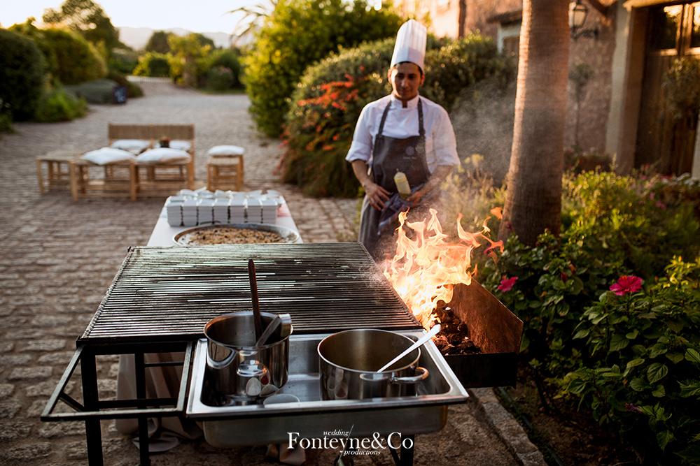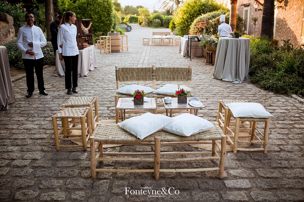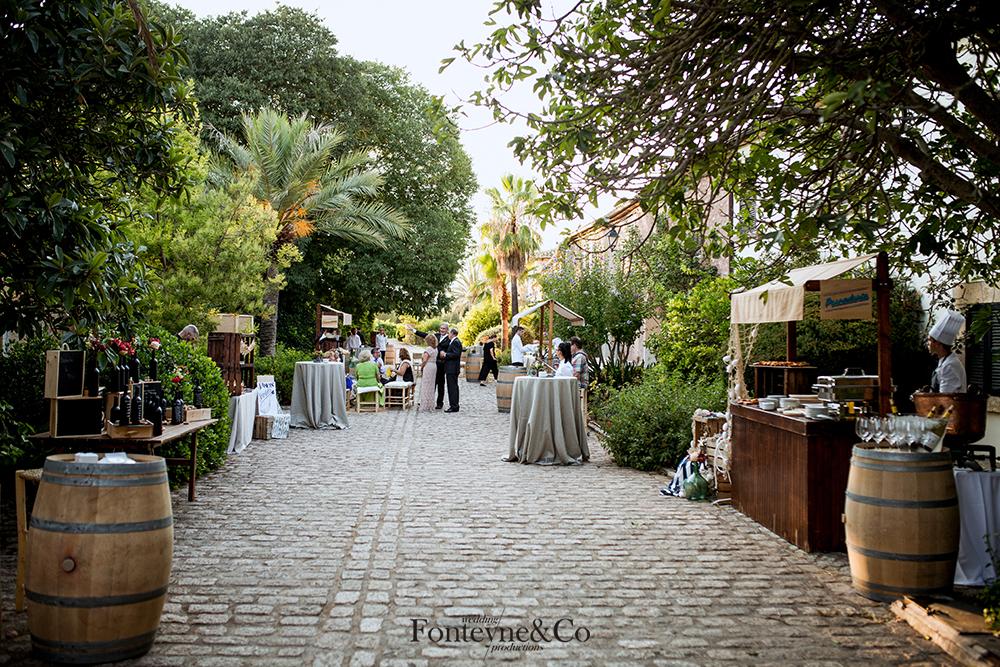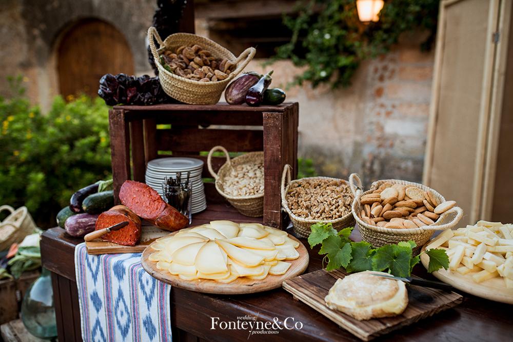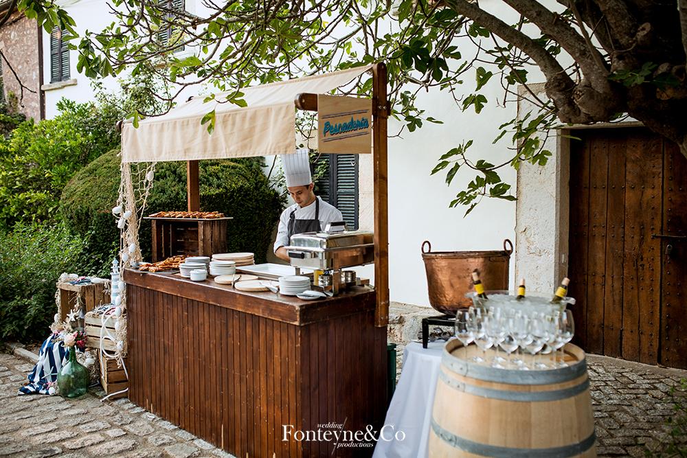 Querían también simular un mercado de calle con puestecitos y Biniagual es el sitio perfecto con sus callecitas y bonitos rincones…Así que se dispusieron tenderetes de madera emulando este ambiente para los invitados. Un original aperitivo que homenajeaba los mercados típicos de Mallorca donde no faltó de nada, ¿bonito verdad?