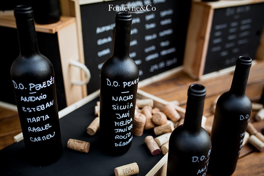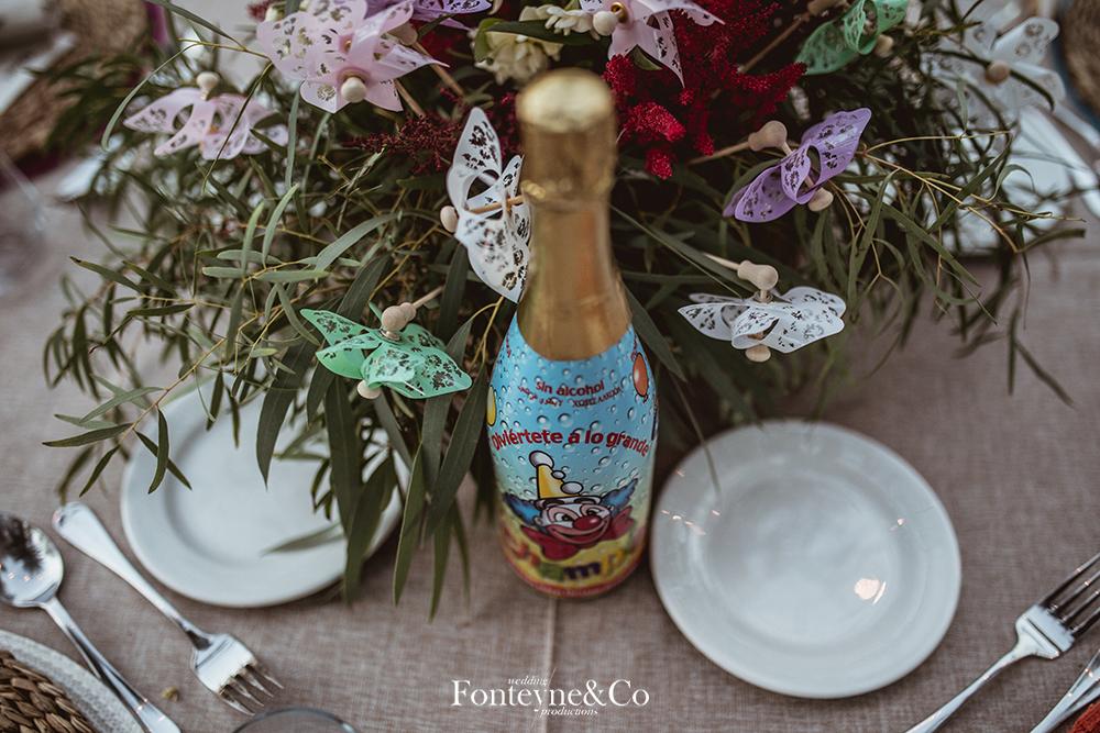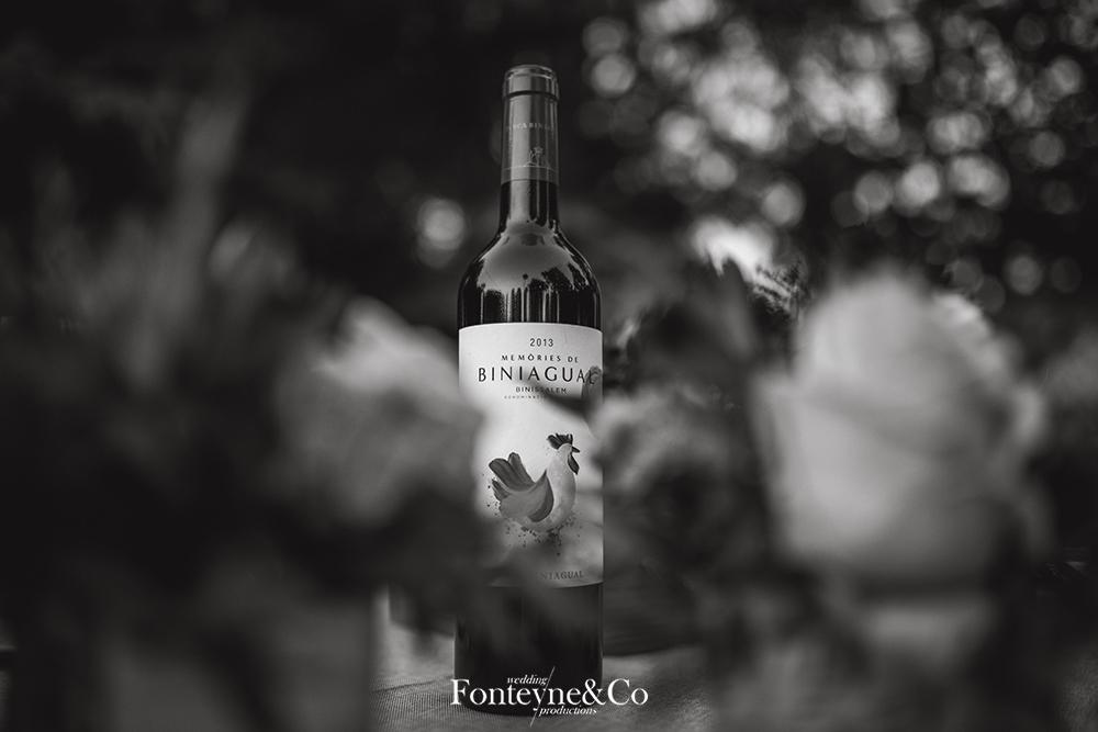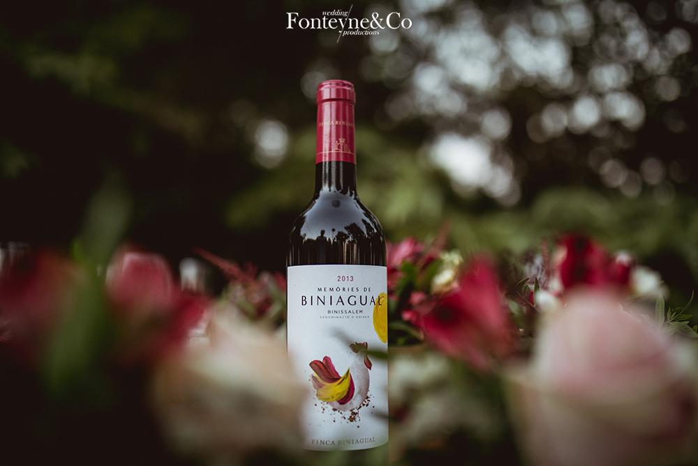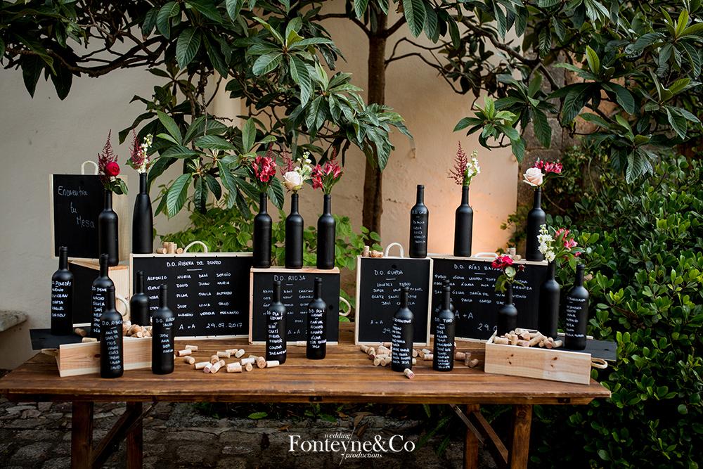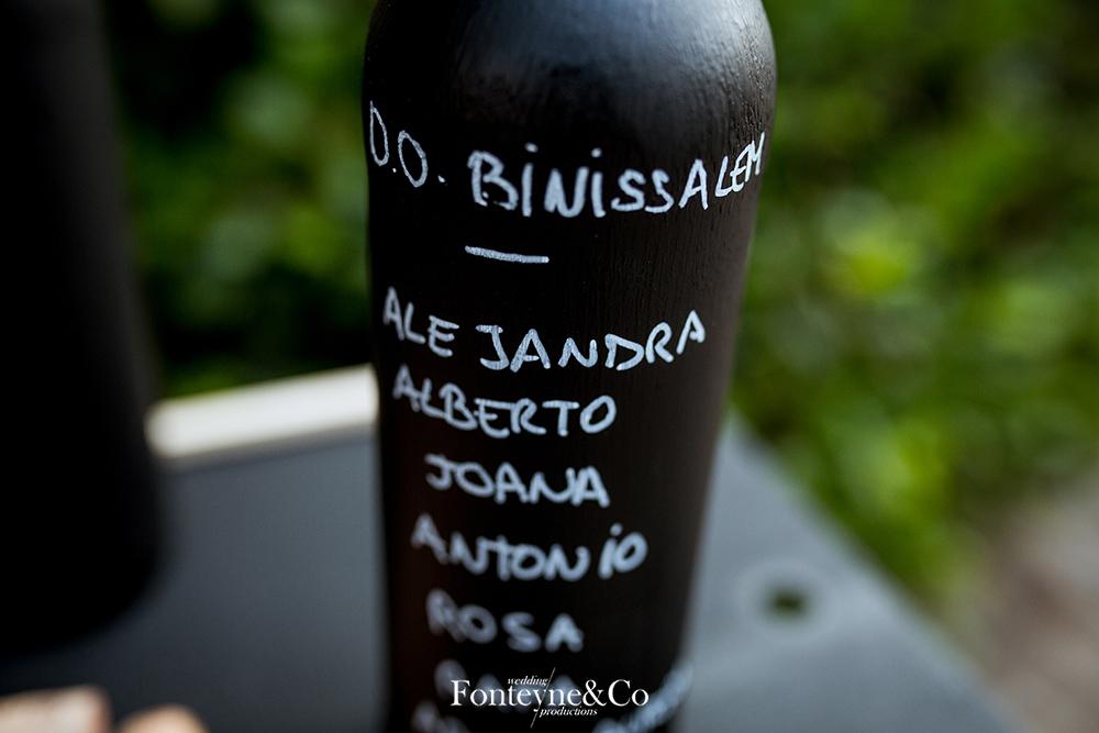 Como los recién casados son muy aficionados al arte de la enología y viticultura no dudaron en darle al vino su máximo protagonismo…Para ello colocamos muchas botellas de vino combinadas con flores y pizarras donde los comensales podían conocer todos los detalles del mismo. Una auténtica invitación a disfrutar de los buenos caldos D.O.Binissalem, cultivados en Mallorca y ¡brindar por la pareja!