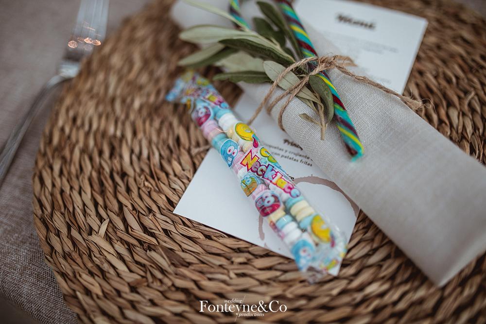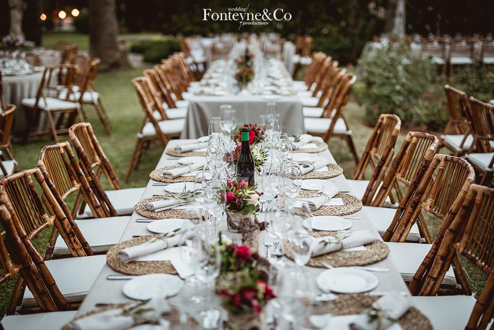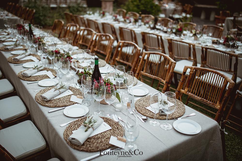 Llegada la hora de disfrutar junto a los numerosos familiares y amigos del precioso momento de un día tan especial en sus vidas, los invitados se acomodaron en las mesas imperiales que decoramos con mucho mimo para ellos… Dispuestas en paralelo, quedaban así de coquetas en un entorno mur rústico y típico de la isla…
