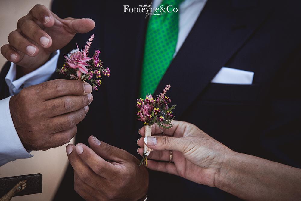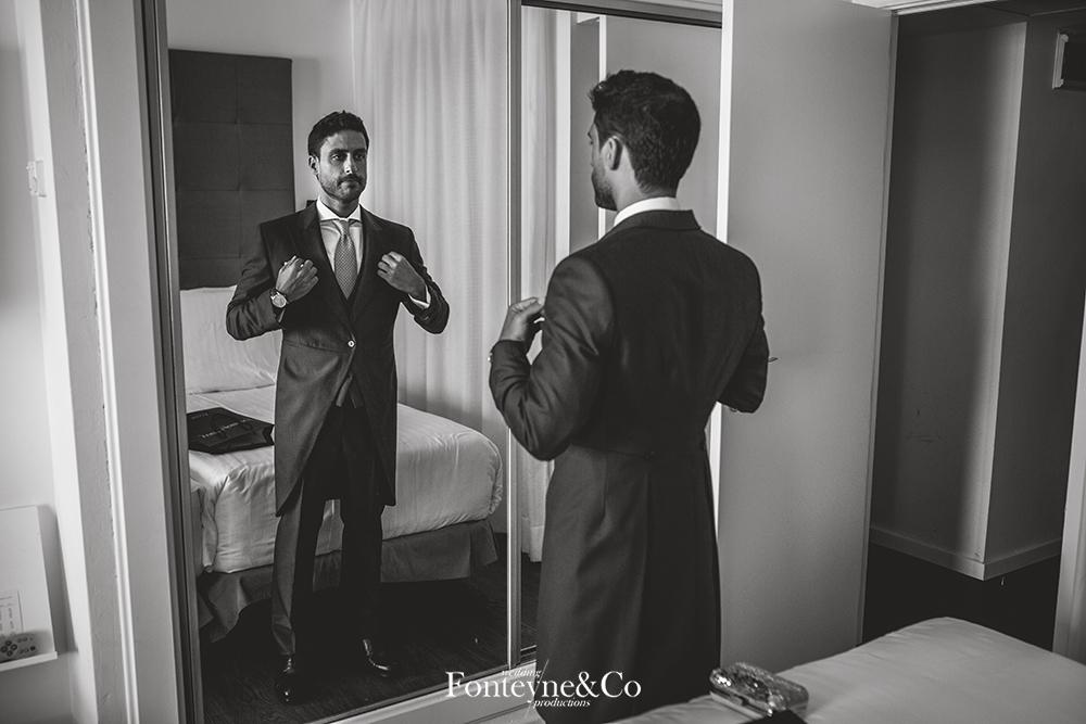 Mientras Alberto hacía lo propio para estar deslumbrante para la que se iba a convertir en su esposa…Con un chaqué perfecto se conjuntó con una corbata de color verde y un prendido a juego con el ramo de la novia.