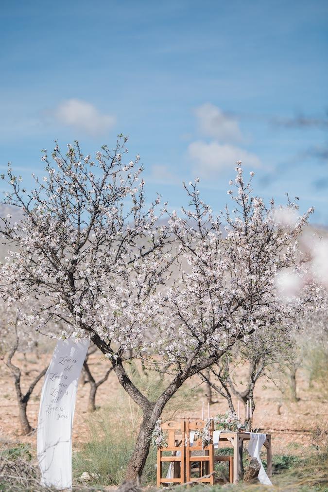 En la mesa principal de madera se presenta un camino en blanco roto sobre el que se dispusieron antiguos portavelas en tonos oro con candelas rosas, un centro de mesa con flores naturales, platos en tonalidades grises y turquesas, cubertería antigua y copas de cristal y vasos de cobre que crearon un conjunto majestuoso. Las minutas escritas a mano en un papel de cobre circular se decoraron con flores de almendro y lo mismo ocurrió con la delicada tarta de Sweet Cup Cakes Almería. En el cabello de la novia también podemos encontrar este guiño floral a su entorno que combina a la perfección con el impresionante vestido de Kite & Butterfly Store de Victoria Rüsche. El encaje y el corte del estilismo contribuyen a resaltar esa delicadeza de un momento tan excepcional y difícil de capturar ya que, tal y como nos cuenta la organizadora, este paisaje convertido en un sueño de color rosa y blanco solo es visible durante dos semanas al año.