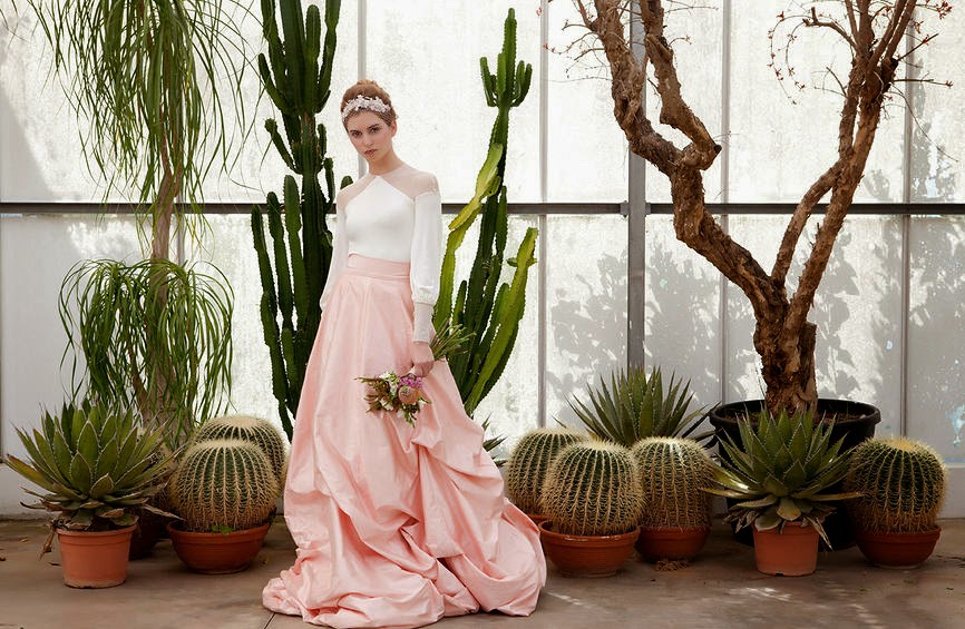 He de decir que estaba muy intrigada por conocer los detalles. Todas conocemos el estilo de Lourdes, elegante y sobrio y por sobrio no quiero decir soso, sino todo lo contrario, discreto y sofisticado. El día de su boda la vimos luciendo un vestido diseñado por ella misma, muy sencillo, en gasa, de manga larga y escote profundoconfeccionado por Pronovias Atelier. Me imaginaba una colección en la misma línea y así ha sido. Me ha llamado poderosamente la atención la introducción del color rosa empolvado, un color delicado, naif y muy favorecedor. En general es, a mi gusto, una colección natural, fresca, sencilla y elegante.