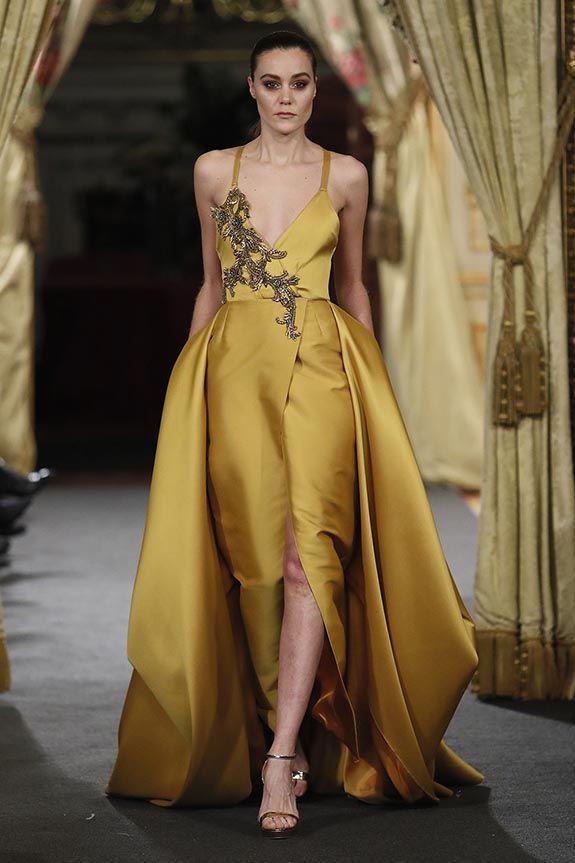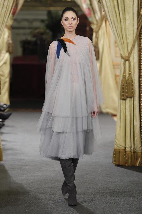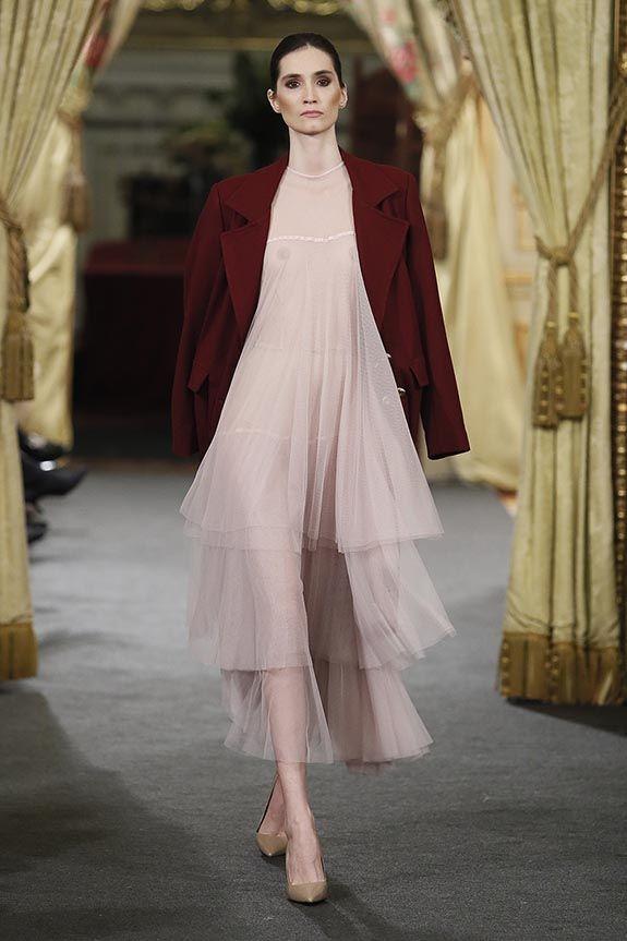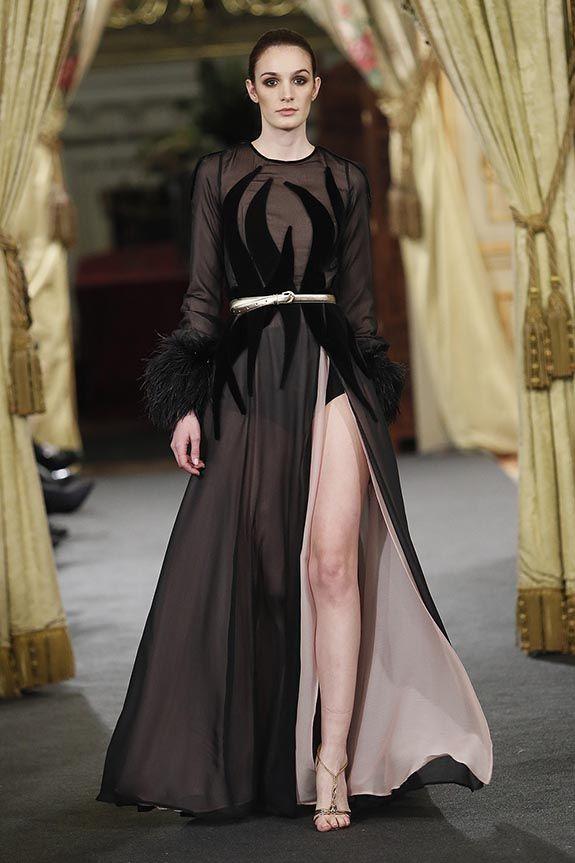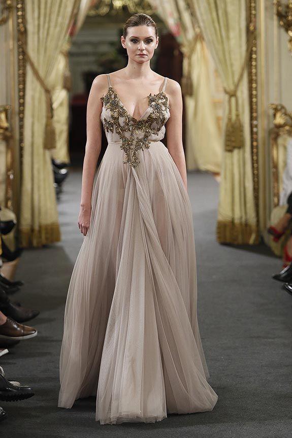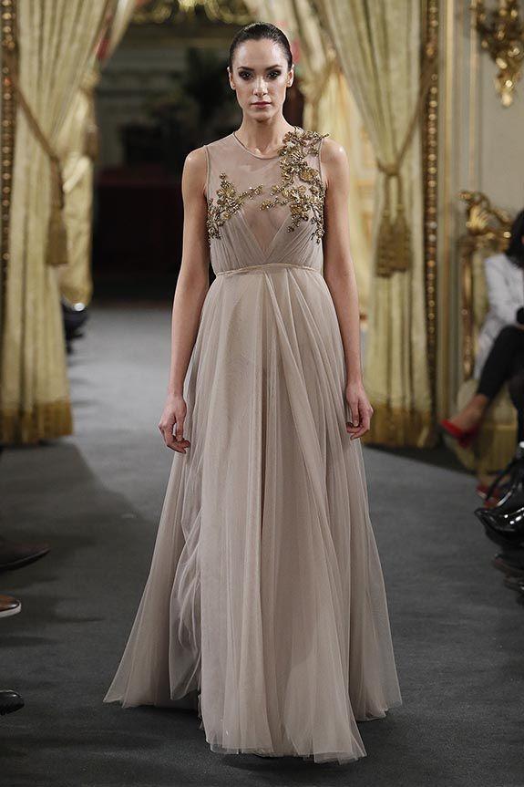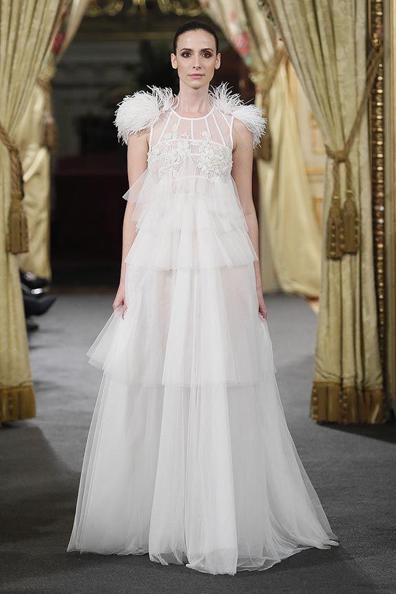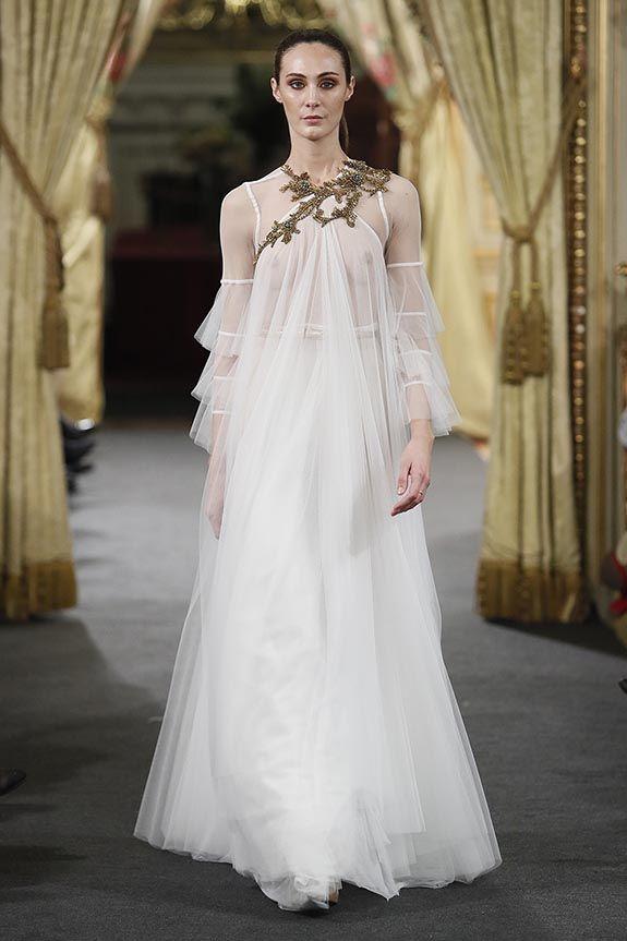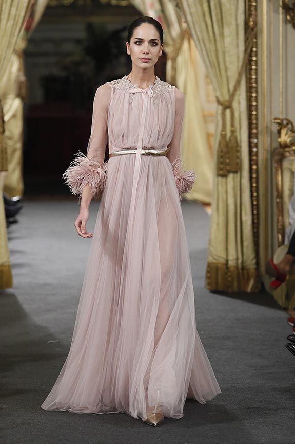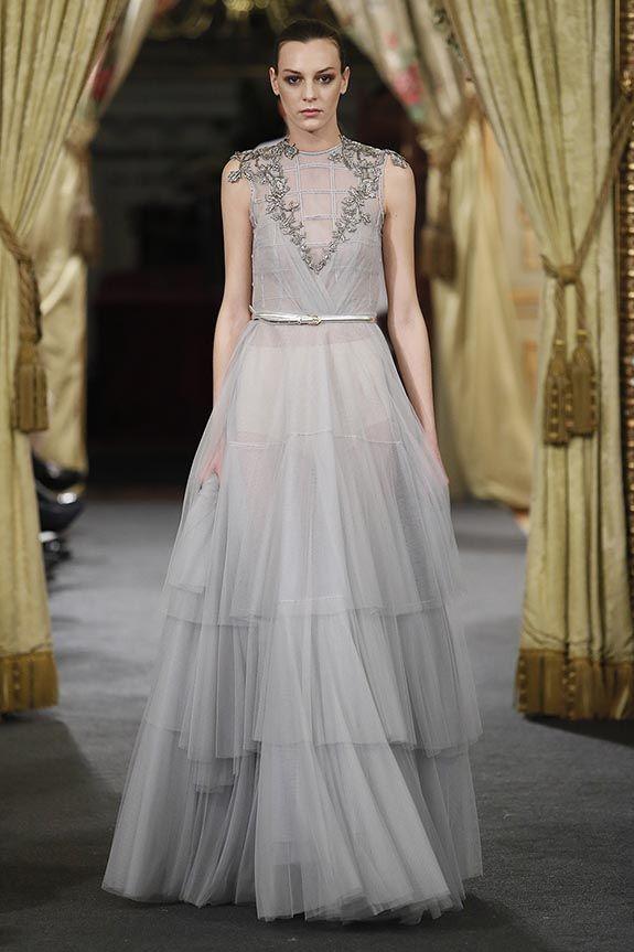 Tul y plumas para una colección que se define como intangible y, a la vez, Extremadamente delicada y muy sutil . “Etérea” pretende ensalzar el saber artesanal de la casa . Los trajes se llenan de encajes con sensuales transparencias, sinuosos escotes y aberturas, en una propuesta con la clara vocación de destacar la feminidad de la mujer. Sinuosas formas en terciopelo para la noche se entremezclan con delicados bordados con formas vegetales en tonos metalizados para las novias . En cuanto a los colores el diseñador nos propone un recorrido desde impoluto blanco, pasando por el gris y los tonos maquillaje, hasta el negro o el amarillo de la noche .