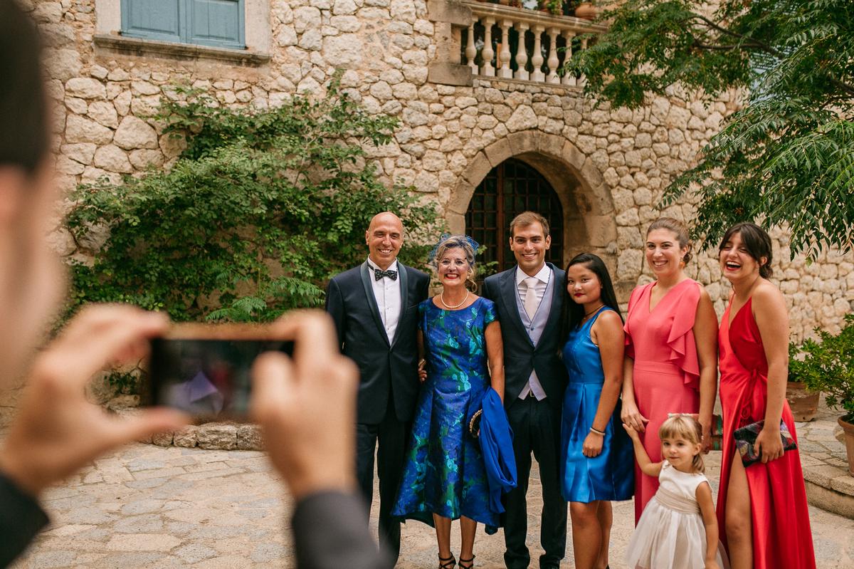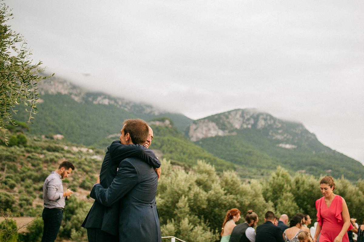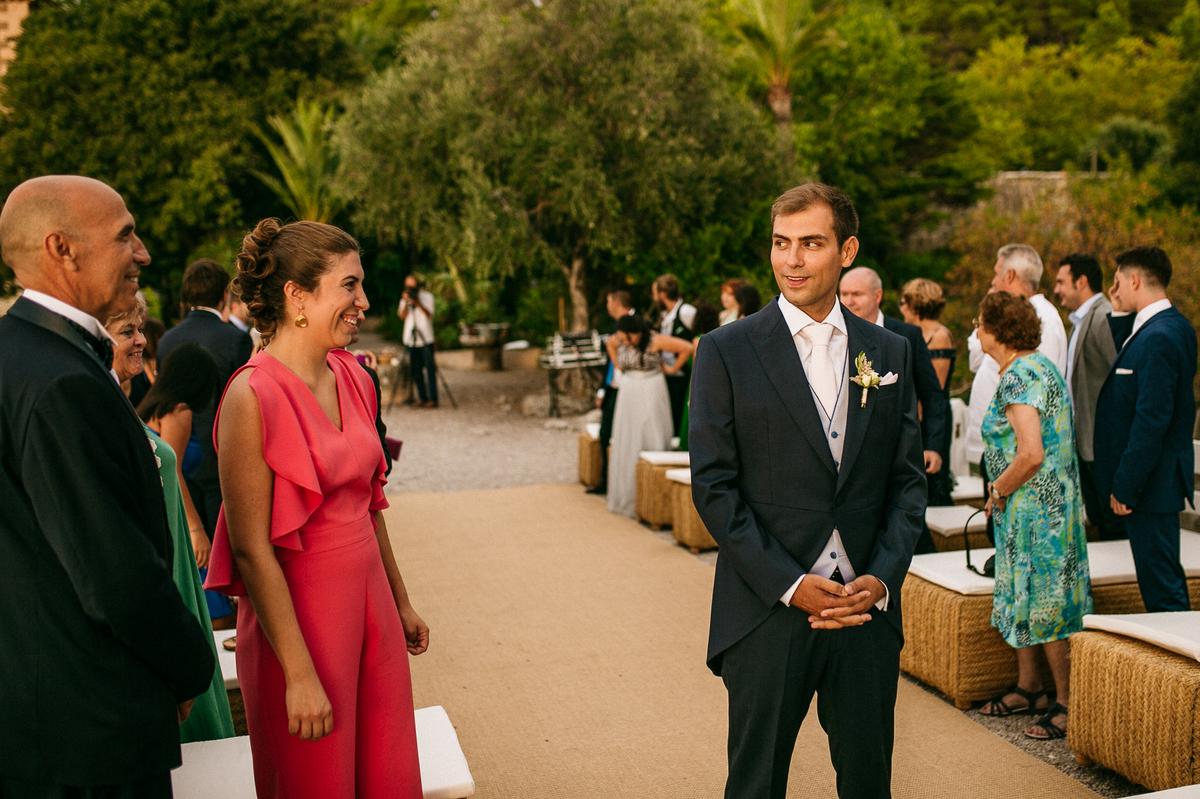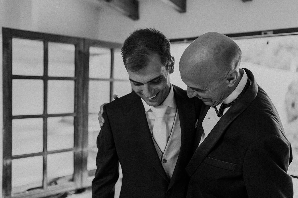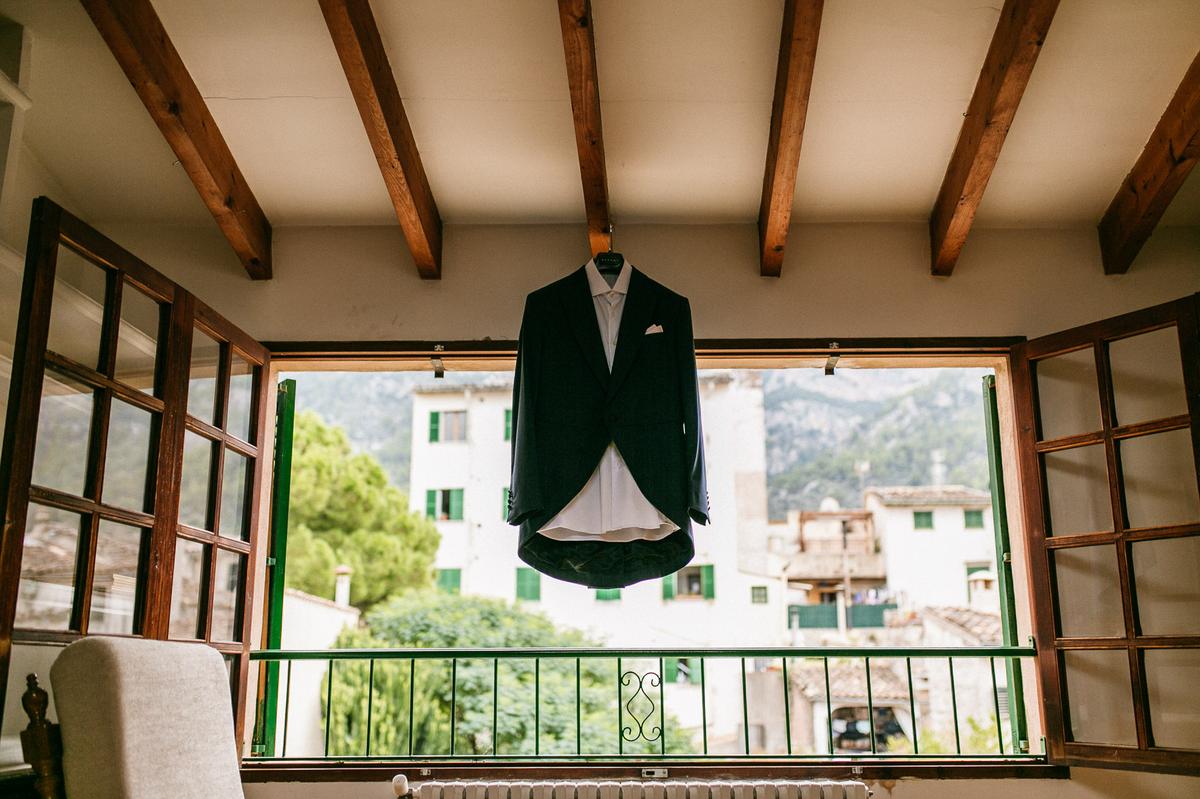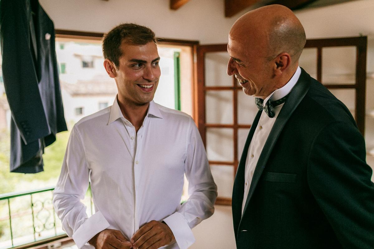 Como los novios son mallorquines eligieron cada uno un lugar familiar donde sentirse arropado en el importante momento de vestirse y prepararse para la esperada ceremonia. Joan por su parte eligió la casa donde la pareja ya convivía en Inca, de donde es procedente el novio. Allí estuvieron junto a él, su padre y su esposa, además de sus dos hermanas. Su padre fue el bestman del novio ayudándole con todo el ritual. El traje de novio era de la firma Uomo y la verdad es que estaba muy guapo.