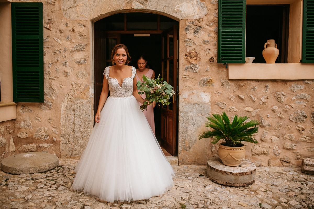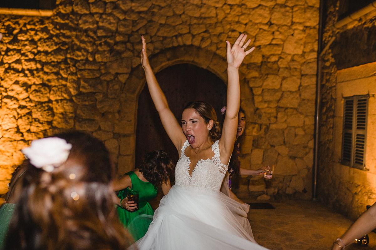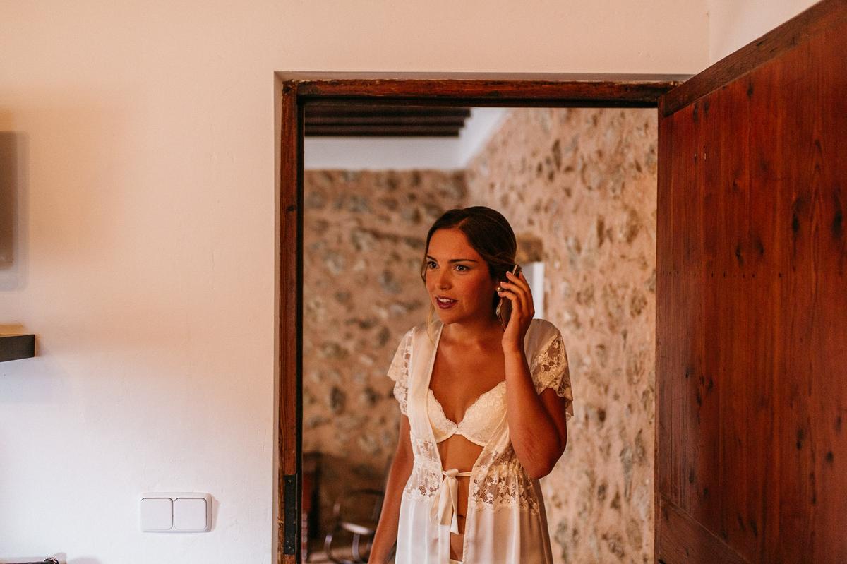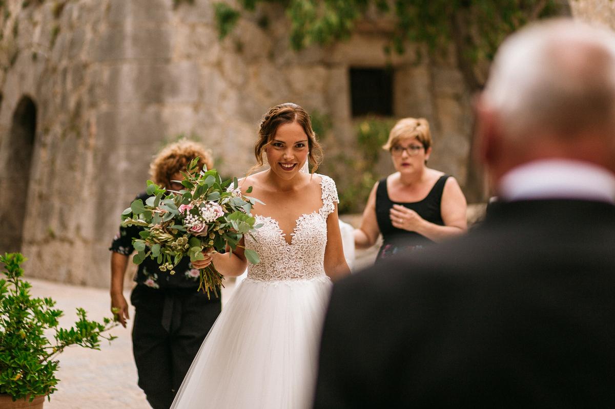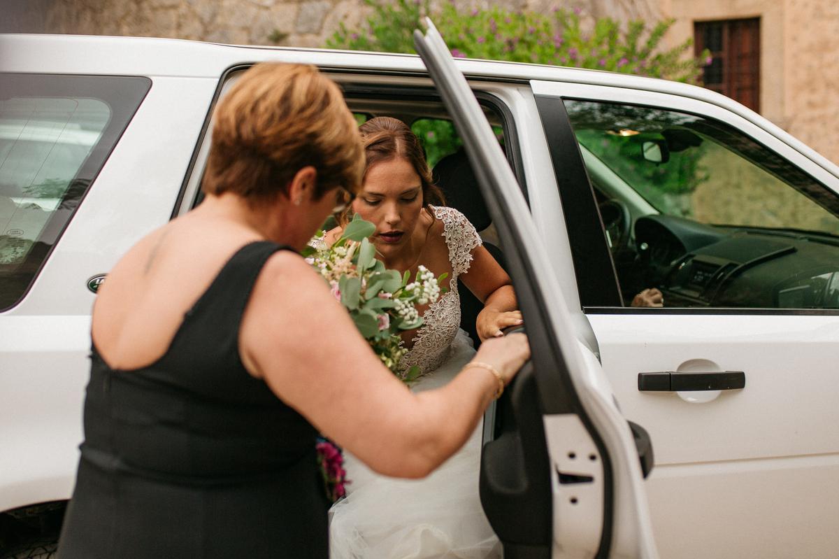 Una vez la novia estaba lista y muy guapa, ocurrió algo que provocó cosquillas de nervios extras en su estómago: las llaves no aparecían y ¡había que salir hacia Son Marroig! Todo el mundo se puso a buscarlas hasta que veinte minutos después aparecieron y pusieron rumbo a la finca. También quedará en la memoría de todos el volantazo que hubieron de dar para esquivar un coche que venía de frente camino de la boda. ¡Cuántas emociones extras!