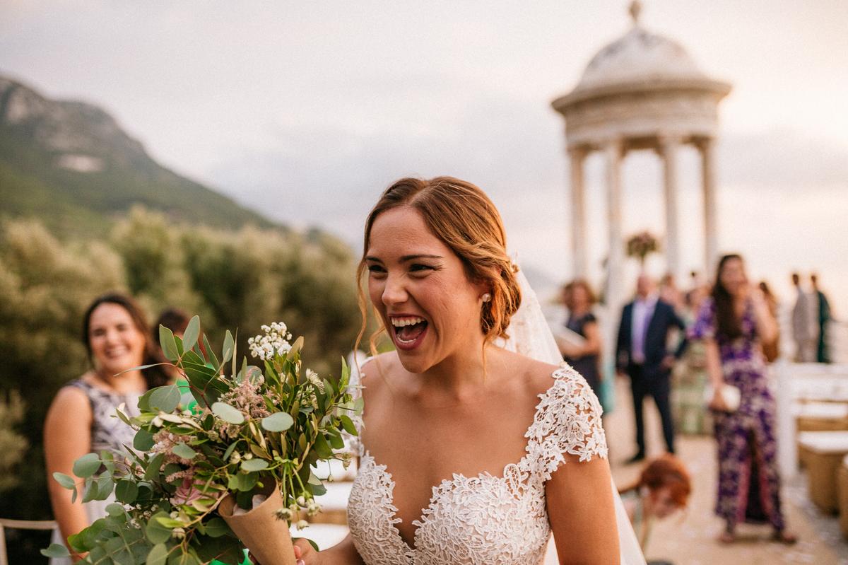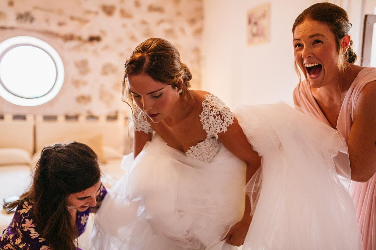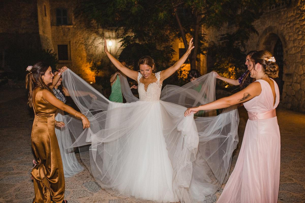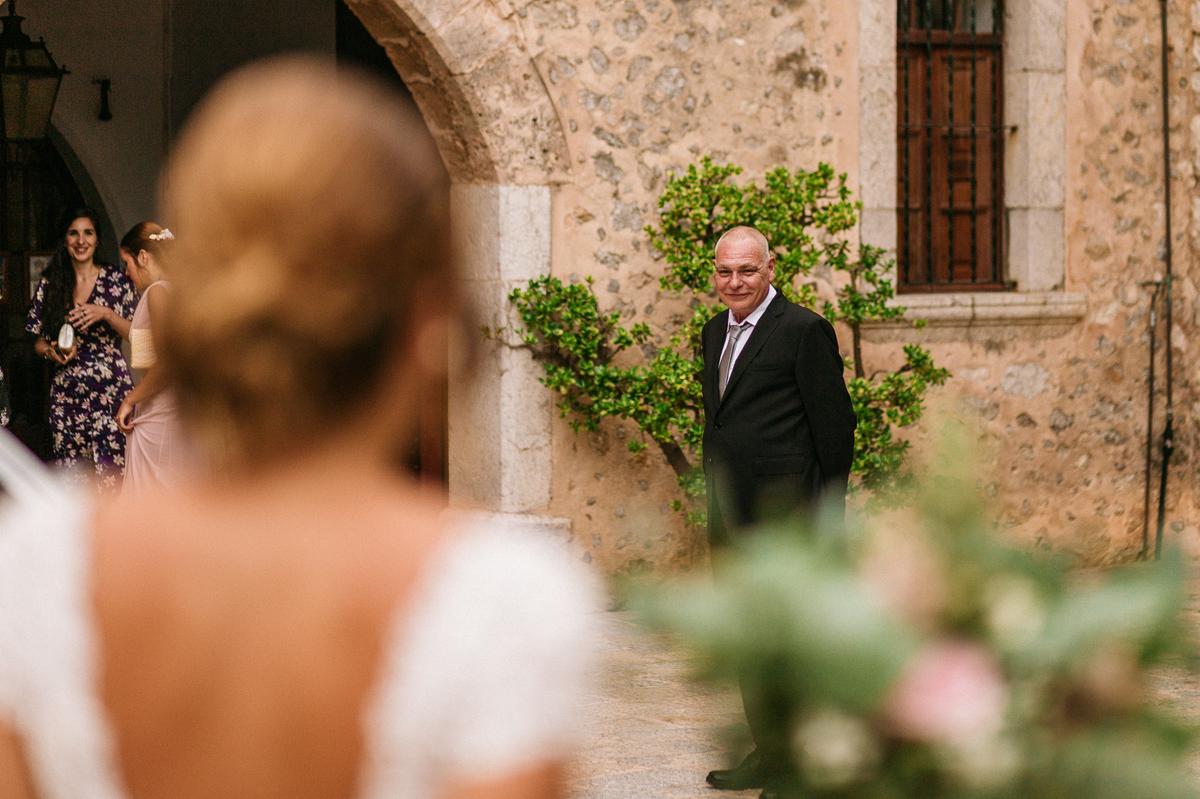 Una vez la novia estaba lista y muy guapa, ocurrió algo que provocó cosquillas de nervios extras en su estómago: las llaves no aparecían y ¡había que salir hacia Son Marroig! Todo el mundo se puso a buscarlas hasta que veinte minutos después aparecieron y pusieron rumbo a la finca. También quedará en la memoría de todos el volantazo que hubieron de dar para esquivar un coche que venía de frente camino de la boda. ¡Cuántas emociones extras!