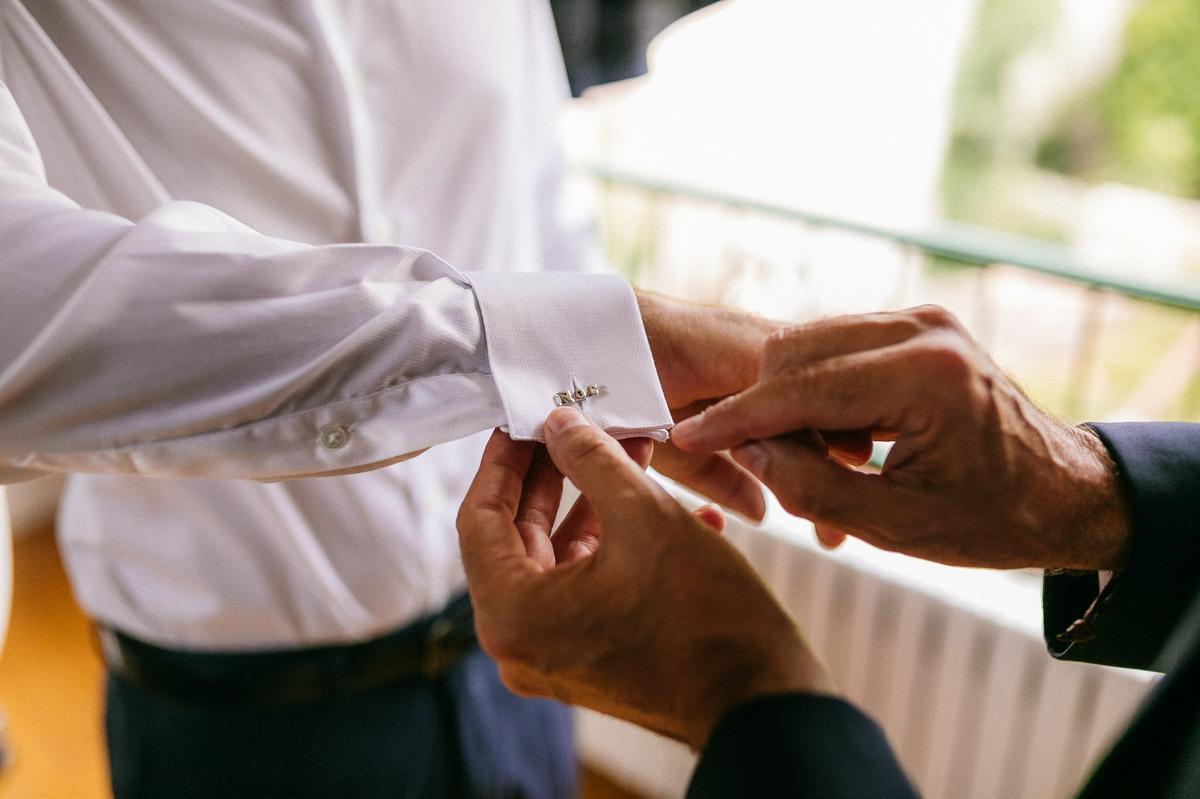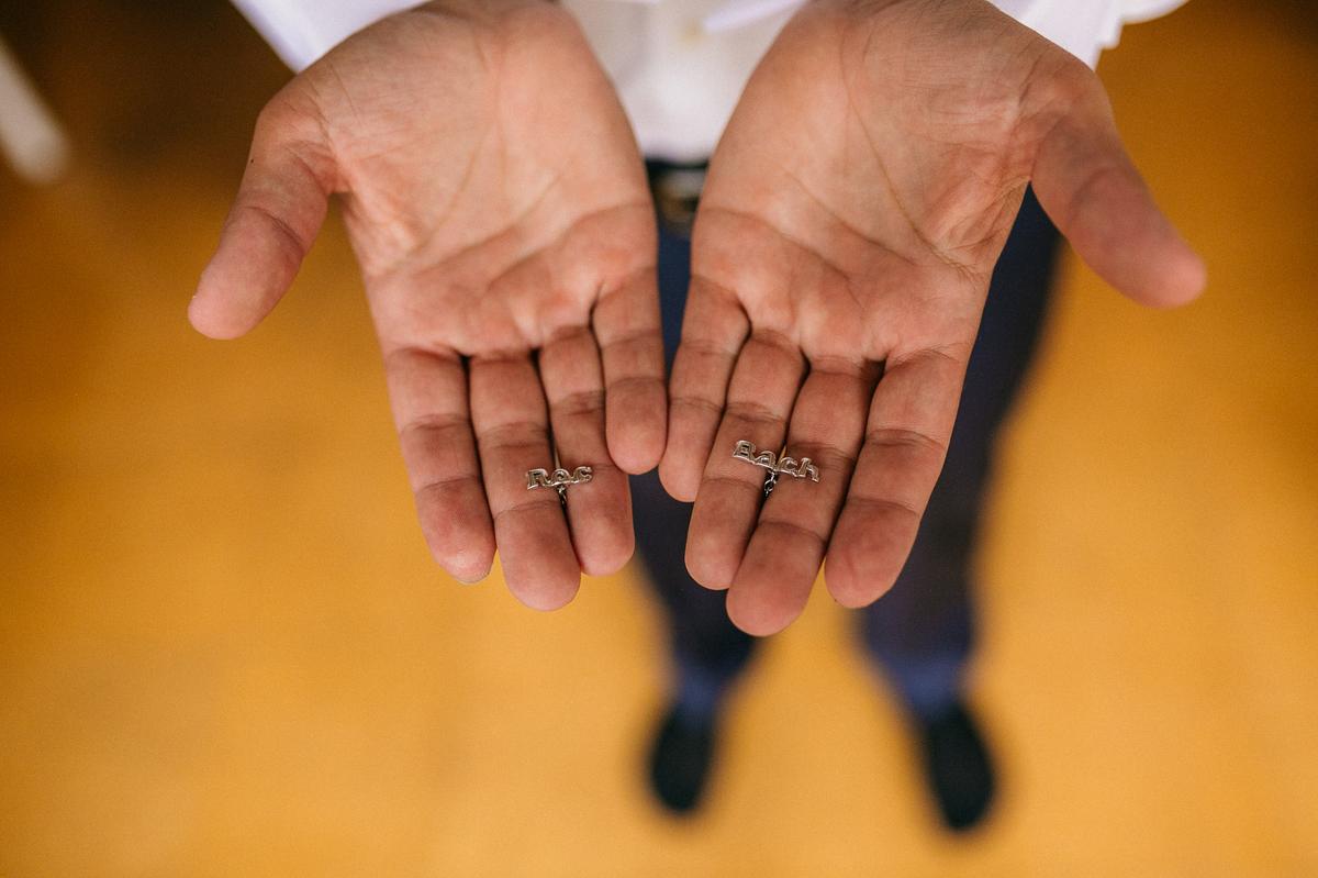 Uno de los detalles del novio fueron los gemelos que lució. Uno llevaba el nombre de Roc y el otro de Bach, el perro y el gato de la pareja. Fueron un encargo especial que hicieron a la Joyería Estela de Sóller y así tuvieron también a sus mascotas presentes en su boda.