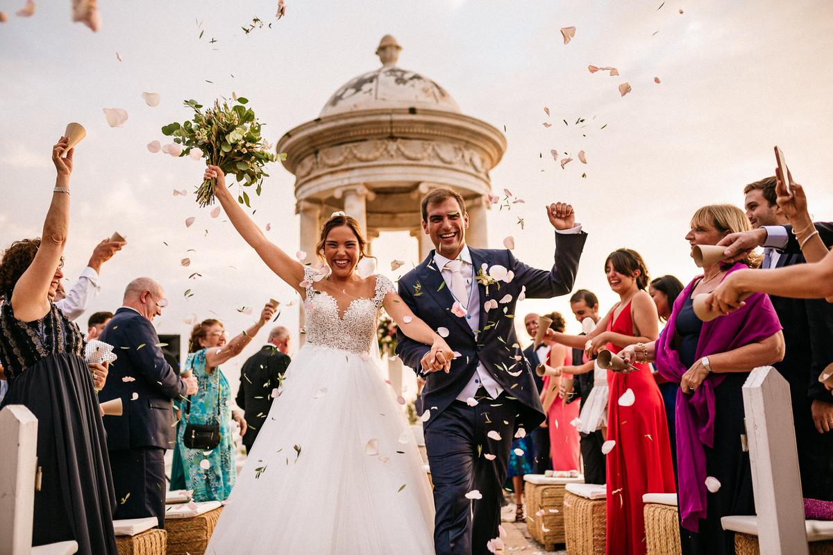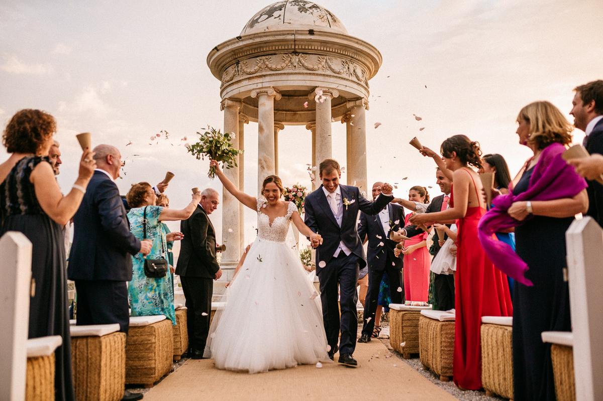 Luego realizaron el famoso paseíllo de recién casados bajo otro tipo de lluvia, la de ¡los pétalos y hojas que habíamos preparado en unos coquetos conos!