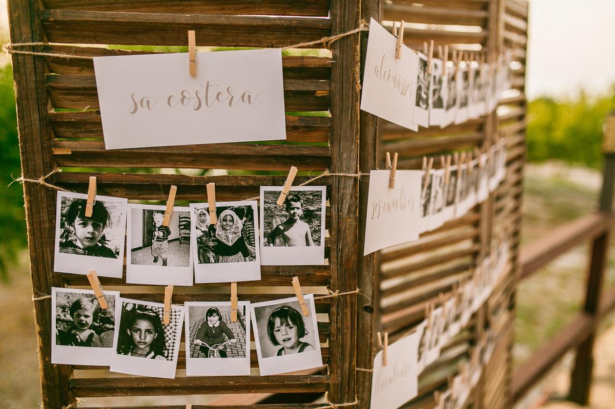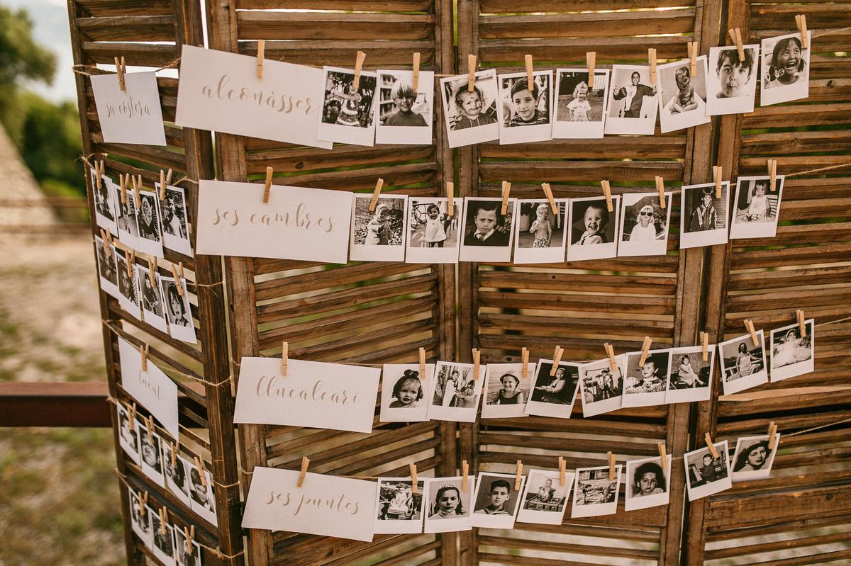 Decoramos las mesas al gusto de los novios, y quedó todo muy coqueto y bonito con la minuta con el menú, centros florales con jarrones dorados a juego con las copas. Para el seating plan se creó un mural de fotos sorpresa con las caras de los invitados cuando eran pequeños y se pusieron nombres de diferentes calas de Mallorca a las mesas, ¡un detalle muy bonito! y se colocó todo en una persianas rústicas de estilo mallorquín.