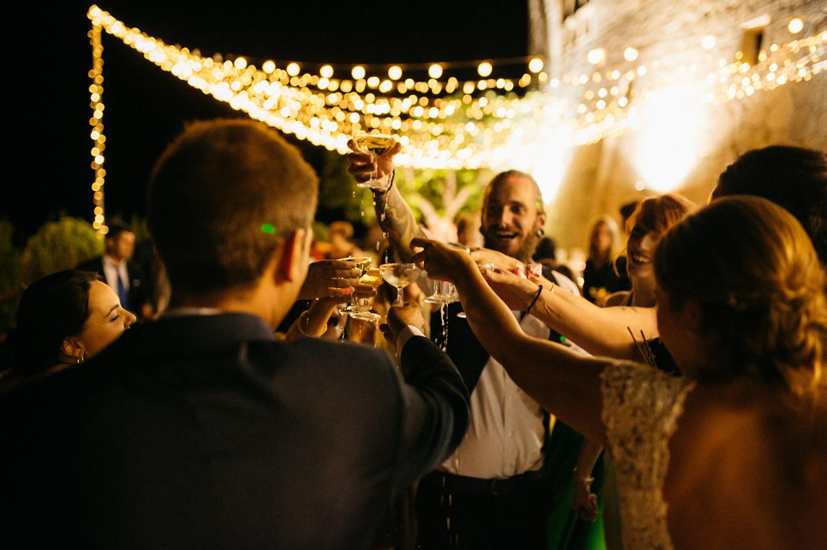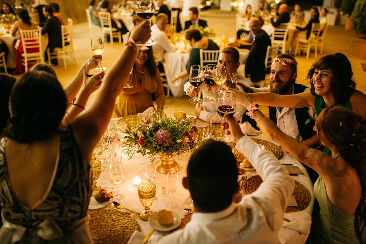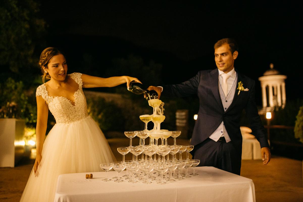 Disfrutaron de un fabuloso banquete de bodas, y tras la cena los novios optaron por crear una torre de copas con cava en lugar de la tradicional tarta nupcial.