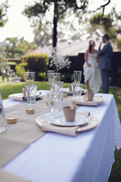 Si tienes la oportunidad de hacer la celebración en un espacio ajardinado mucho mejor que en un salón cerrado. Para ésta boda han elegido mesas imperiales, es un opción que personalmente me encanta y que han decorado con mantelería blanca, un camino de mesa de tela de saco, y jarrones con paniculata, como veis es muy simple pero queda bonito.