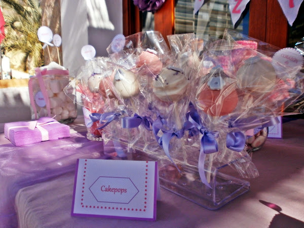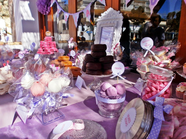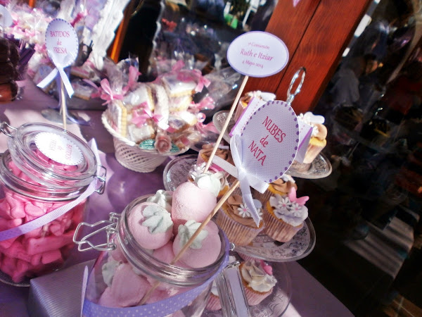 La Candy tenía que ser muy dulce, tanto como Ruth e Itziar, por eso nos decantamos por el lila y el rosa, sus colores preferidos; coronada por un mar de pompones y banderines en vichy totalmente personalizados, la Candy fue un éxito total, cuando por la noche fui a recoger no quedaba ni una miguita.