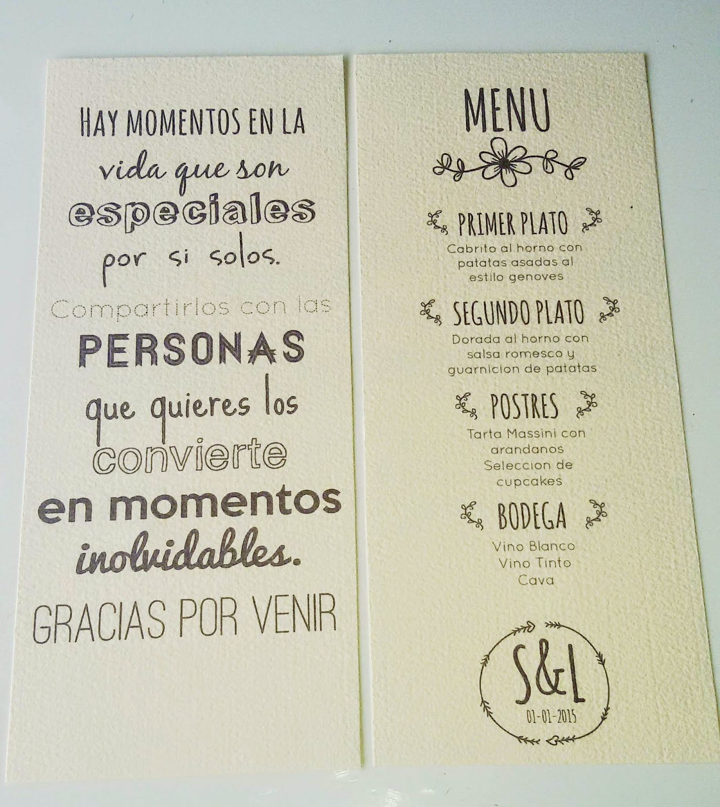 Y presentarlas como queráis, podeis imprimirlas a doble cara o bien pegar las dos parte de manera que en una cara veamos el texto de agradecimiento y en la otra el menú.