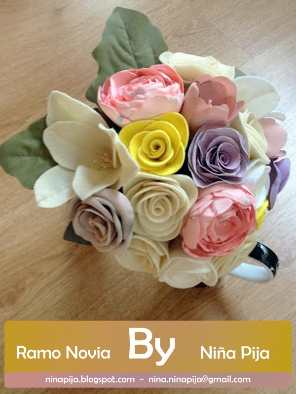 La tendencia en 2014 para ramos de novia es la combinación de formas y colores así como de materiales y a esta tendencia nos hemos apuntado en niña pija y hemos comenzado el año combinando fieltro con tela teñida y velada y puntilla.