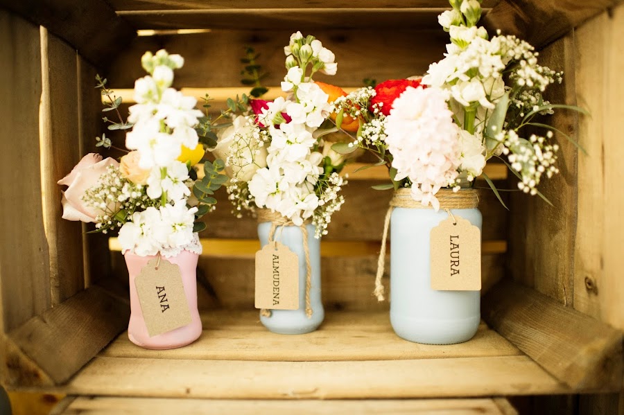 Para los detalles de los invitados, pintaron tarros de cristal con el nombre de cada invitada y El Jardín de Mamá Ana se encargó de decorarlo con flores; y para los hombres regalaron cervezas artesanales personalizadas por los novios. Los niños recibieron su kit de pinturas y además se lo pasaron genial personalizando las zapatillas que Salva y Bea ofrecieron a sus invitados para descansar los pies del bailoteo.