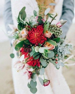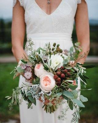 Peonías, rosas, dalias, cardos, crisantemos… y verde, mucho verde como el olivo, la mata, el eucalipto, etc. Además, estas flores pueden ser acompañadas de diferentes elementos como las plumas o las frutas.