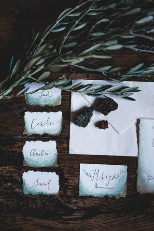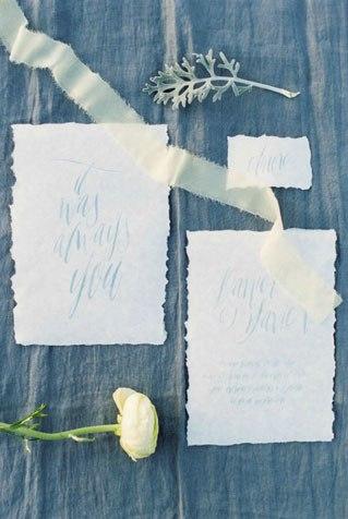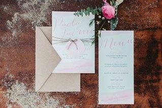 Una invitación bohemia tiende a ser sencilla pero cuidada. Con un papel de alto gramaje y muy poco ostentosa. Puedes optar por invitaciones hechas a mano y dibujadas con acuarela; invitaciones escritas a mano o con un diseño handletering o invitaciones que se complementen con algún elemento que utilices en la decoración de la boda (como una pluma o una flor).