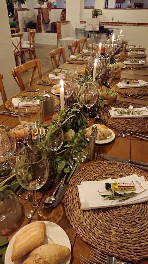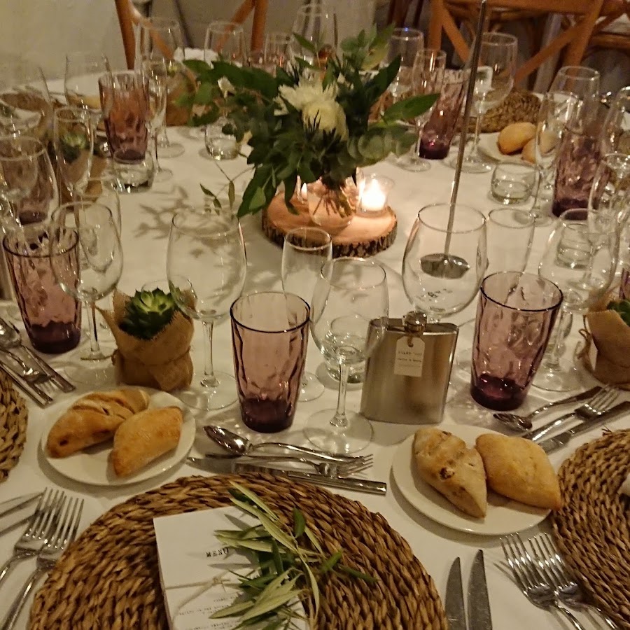 Sobre el menú colocamos un pequeña ramita de olivo y una suculenta en un lado de la mesa, que preparamos totalmente personalizada, cubierta de tela de alpiñería y etiqueta rústica.