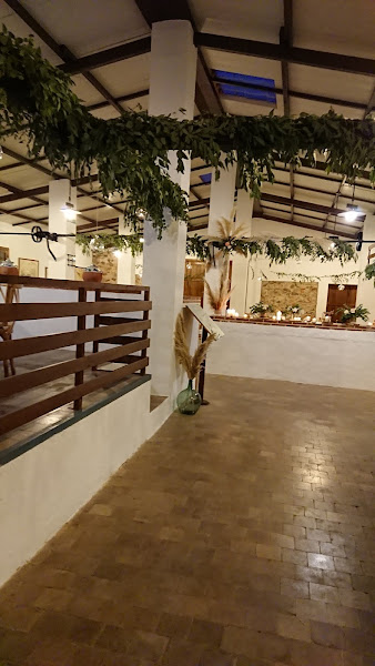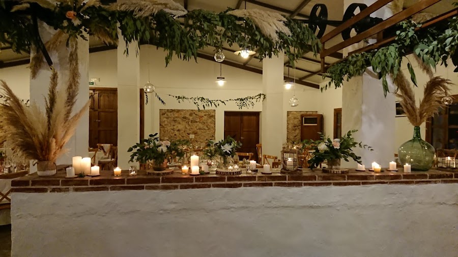 Para la celebración creamos una decoración colgante a base de eucalipto gomera y para el murete mezclamos elementos como pampas, velas y centros de flor variada.