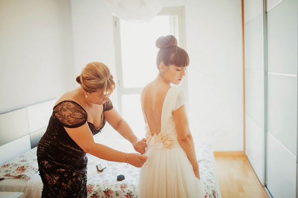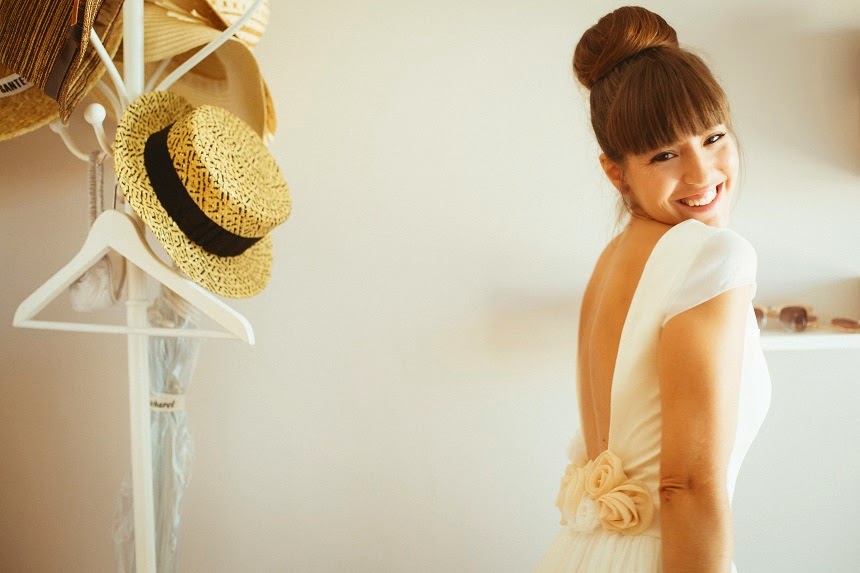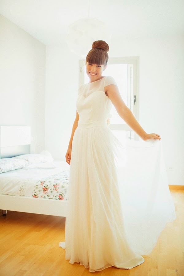 Una vez elegido el sitio, y la fecha, tocaba la hora de encontrar el vestido perfecto de la novia, que quería sentirse ella misma, natural, y sobretodo cómoda. Después de recorrer un montón de diseñadores, encontró lo que buscaba; un vestido con espalda descubierta y acabado como detalle en unas finas flores, de la diseñadora catalana Imma Clé. Momentos de diseño , junto a Imma en su espectacular atelier de Canet de Mar, que dieron como resultado su vestido soñado.