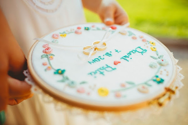 Los novios también quisieron poner su granito de arena en la boda mediantes los DIY que fueron haciendo durante la temporada de preparativos. desde un bastidor para llevar los anillos, las iniciales en decoupage que presidiría su mesa.