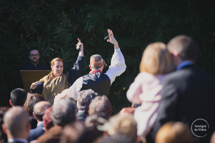 La primera sorpresa que se llevaron los novios se la encontraron nada más llegar a Mas Llombart. En la ceremonia, les esperaba un grupo de jotas ya que sus orígenes familiares están en Zaragoza, y era algo que les hacía especial ilusión.