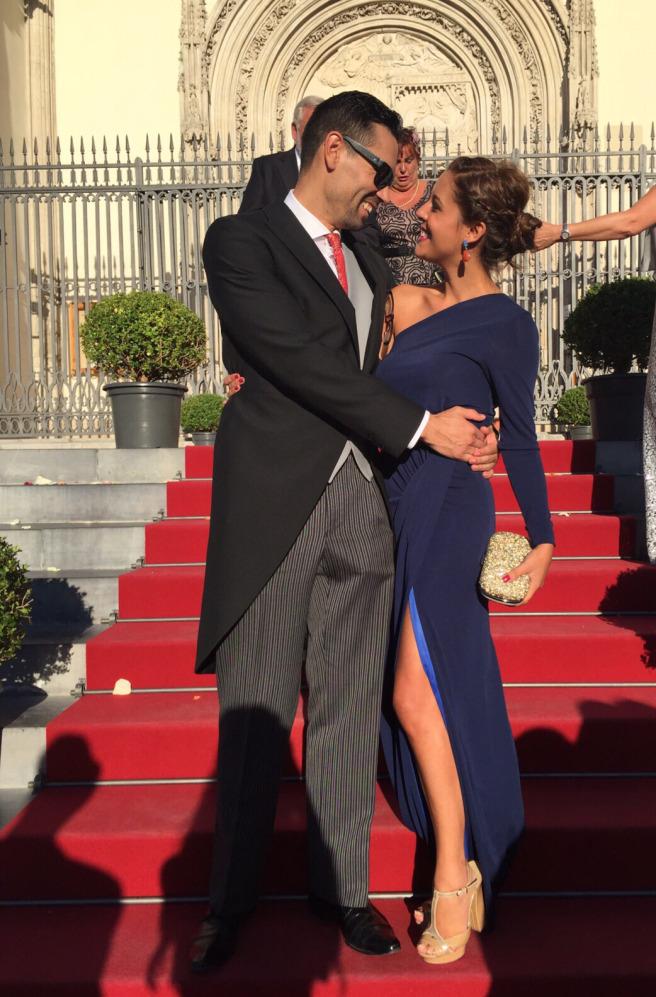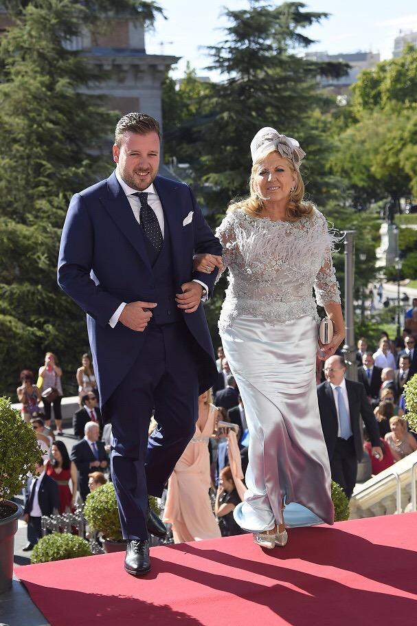 Se casaron en la iglesia de los Jerónimos. Llevaba un impecable chaqué monocromático tres piezas en tono azul, que a mi parecer estaba realmente guapo y favorecido. Mi tía Trini, llevaba un dos piezas en color perla con falda de raso al biés y un cuerpo de encaje con pedrería y plumas con sutiles transparencias. Estuvo muy acertada completando el look con un tocado de rafia en vez de como se esperaba y estamos acostumbrados en estas bodas, la típica mantilla. (Debo confesar que ya ella me dijo que no la llevaría)