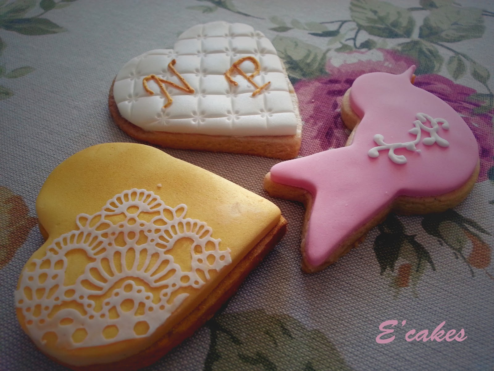 Una vez tenemos la tarta definimos las galletas. Después de enseñarle varios modelos Patricia quiso corazones blancos con las iniciales de los novios. Y así quedaron: