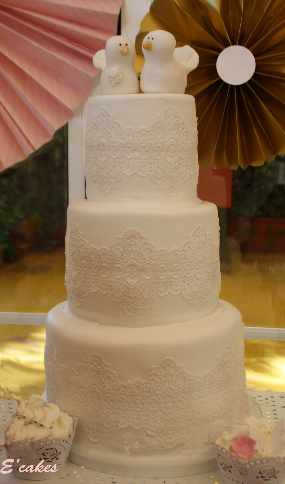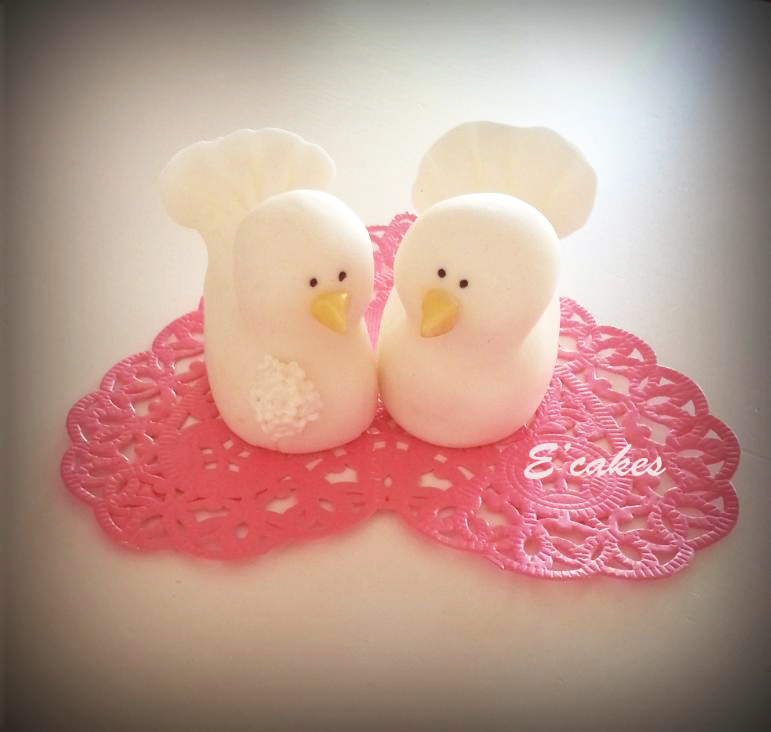 No sé si está bien que yo lo diga pero.... ¡me encanta como quedaron los pajaritos! Sencillos como el resto de la tarta, en blanco impoluto con un toque de dorado en el pico.