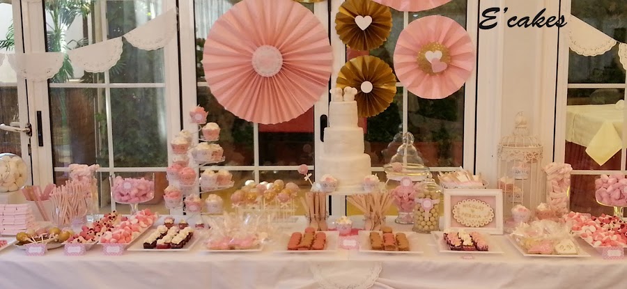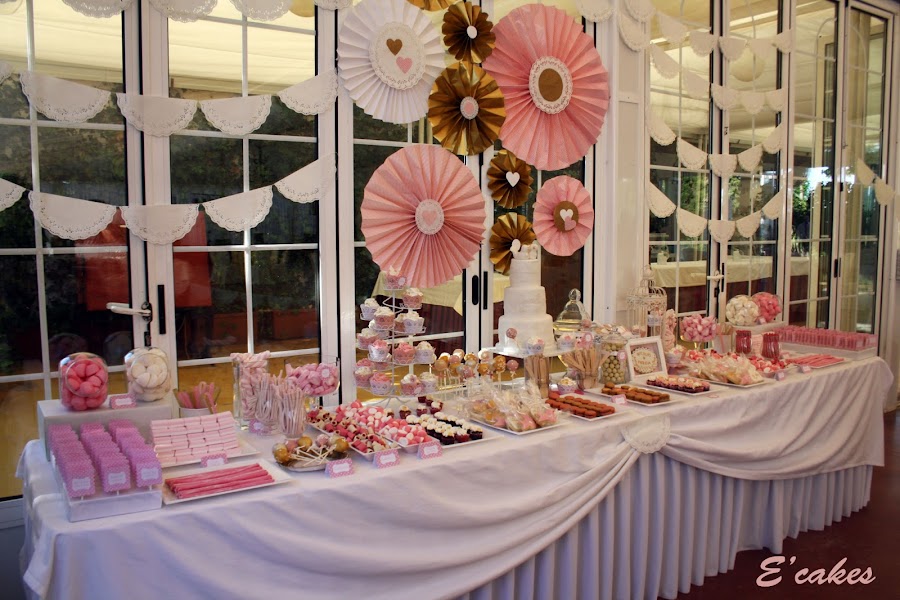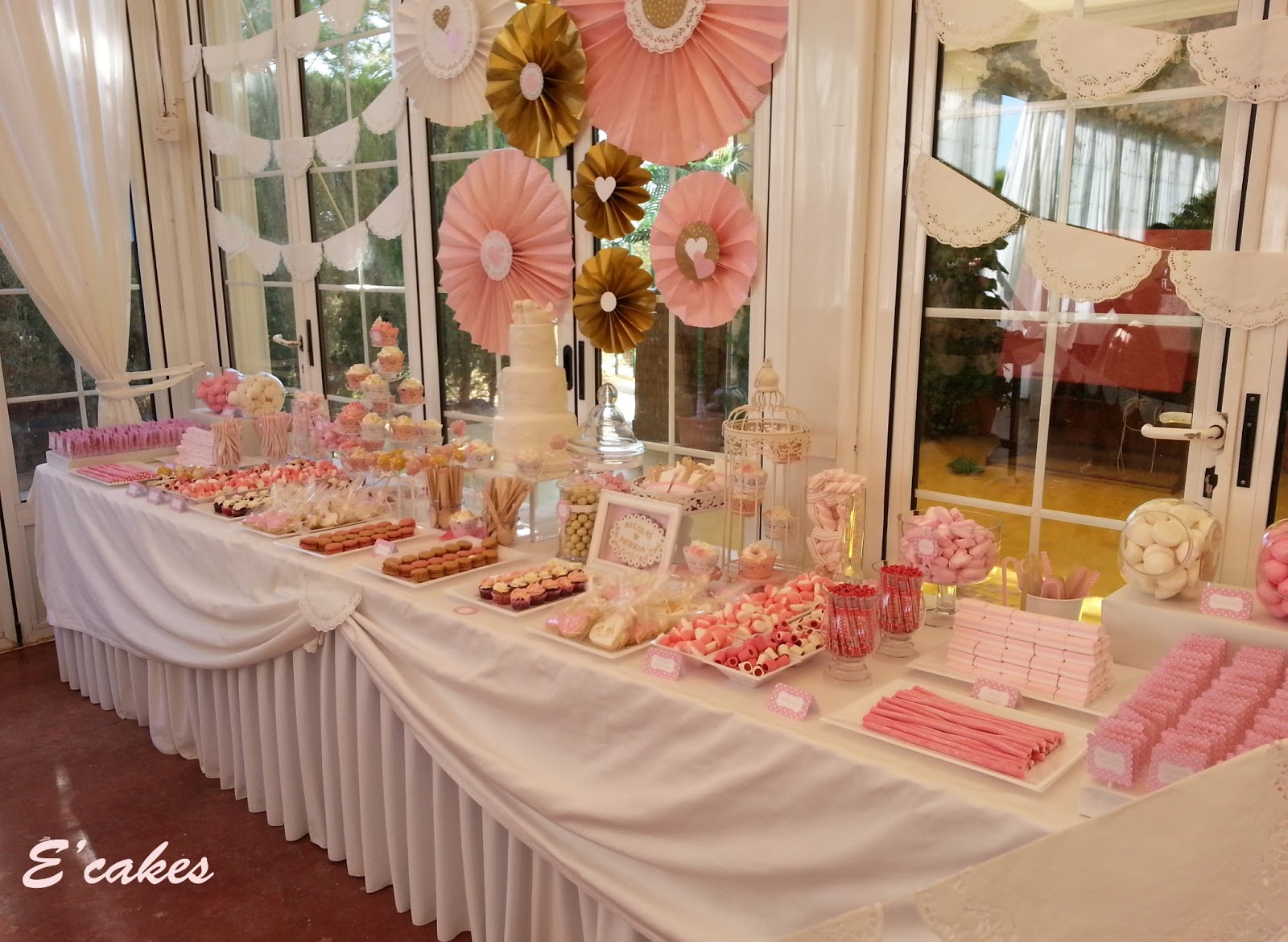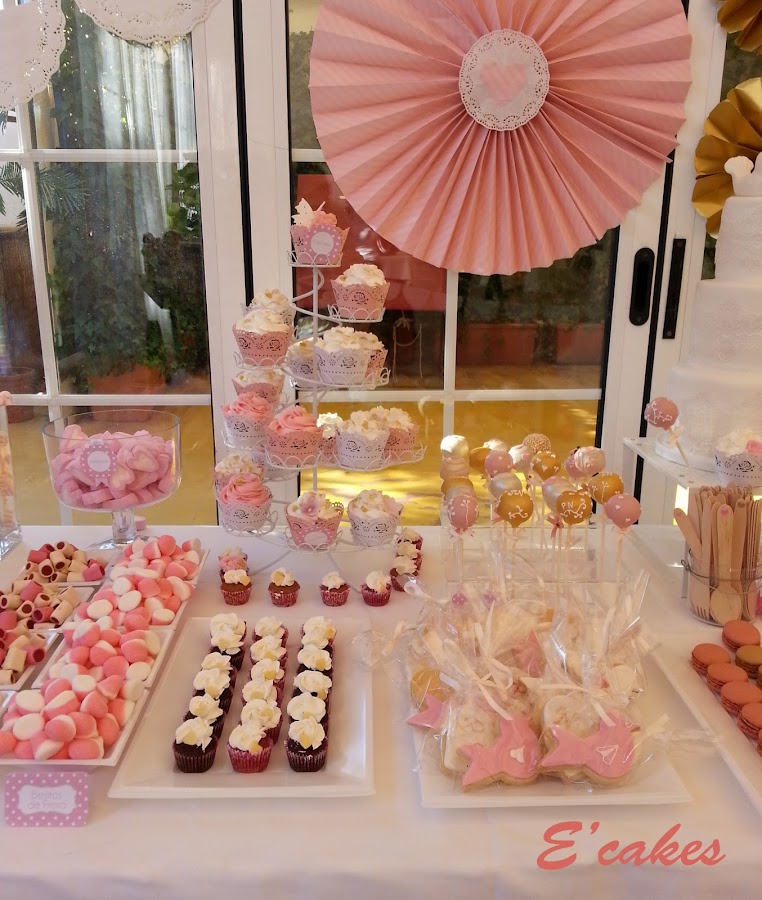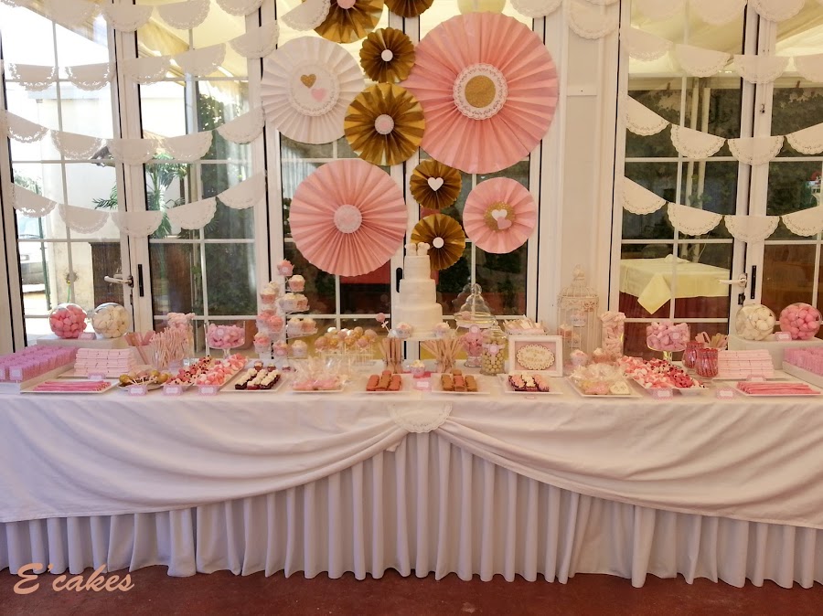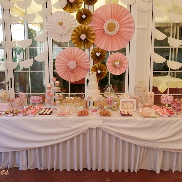 Lo primero el espacio y los colores. La mesa contaba con 4 metros en total, 2 metros para chuches de las que se encargaban Sara y Úrsula y 2metros centrales para los dulces. Los colores rosa, dorado y blanco. Las chicas me dejaron uno de los carteles que ya tenían hechos en rosa para que supiera el tono exacto de rosa.