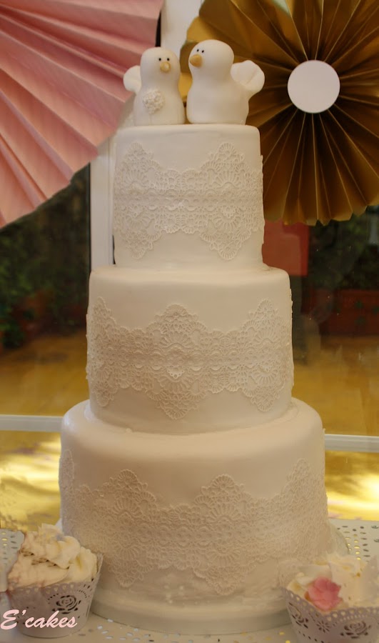 Para empezar le enseñé a Patricia las revistas de tartas de boda que tenemos para que los novios puedan ver formas, colores, detalles....y después de ver una tarta con pajaritos como toppers Patricia dijo que quería pajaritos, que le encantaban los pájaros. Pero me dijo que esos no le gustaban, que me mandaría la foto de unos que había visto por internet. La tarta debía ser blanca impoluta, nada de colores, sencilla y elegante. Le enseñe el encaje de azúcar y le encantó la idea.
