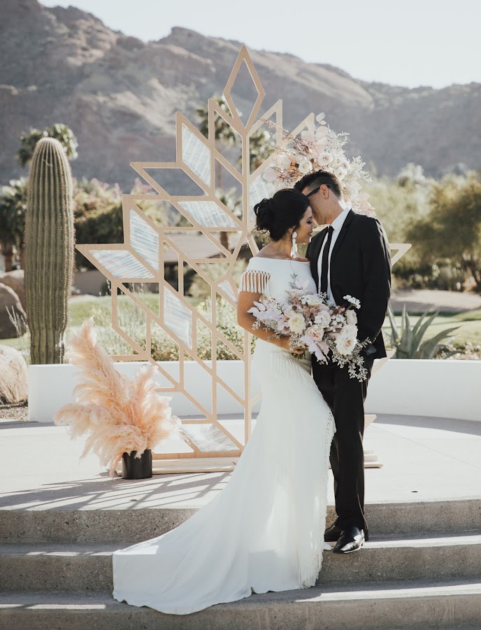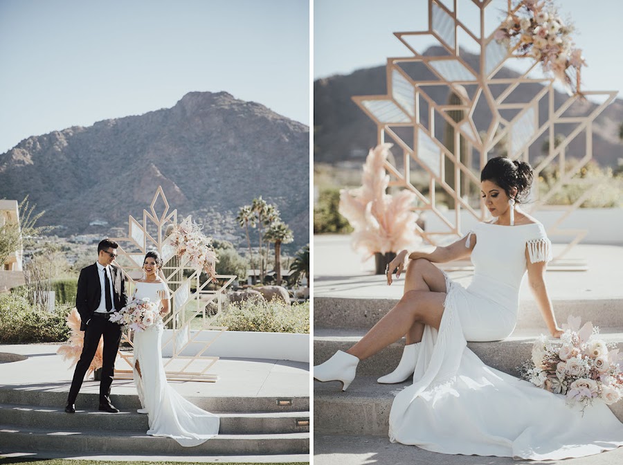 Un altar espectacular a modo de flechas que juega con prismas iridiscentes, y una decoración en conjunto, llena de espejos rotos y piezas geométricas con cierta reminiscencia rockera de los años 60-70, mezclado con una decoración floral con pampas rosas y flores en tonos malva y blancos.