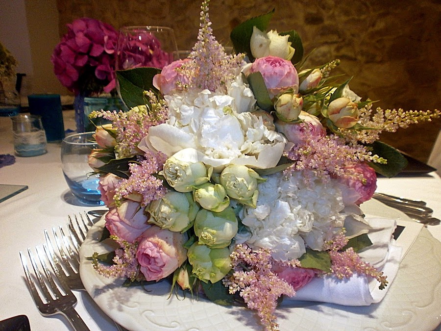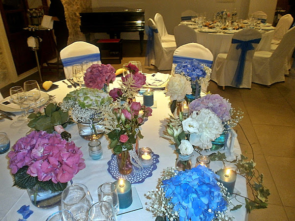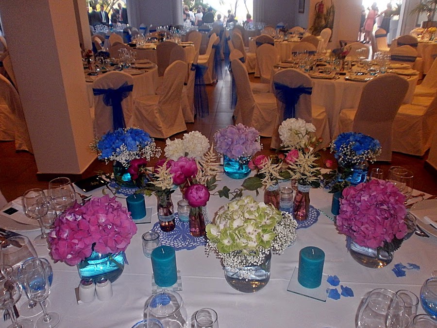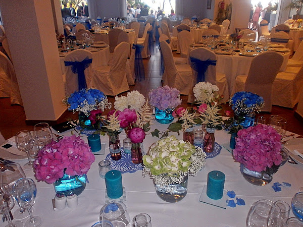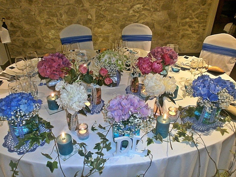 Los colores de su boda, el azul, uno de los preferidos de la pareja, mezclado con toques de rosa en diferentes tonalidades y las flores elegidas un pupurri que casaba a la perfección: lisianthus, peonías, hortensias y paniculata.