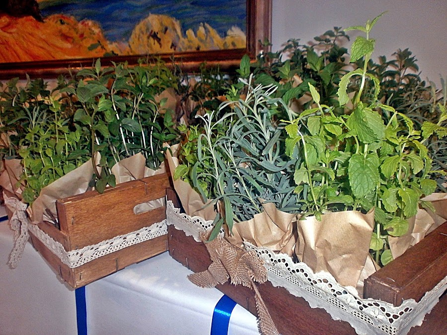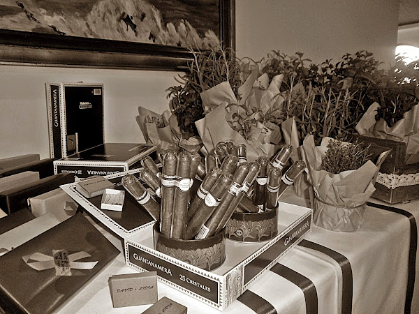 Como detalle para sus invitados eligieron plantas aromáticas variadas, que preparamos con papel kraft y cuerda y habanos para los gentleman.
