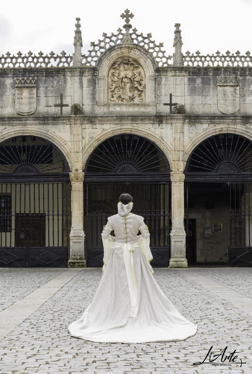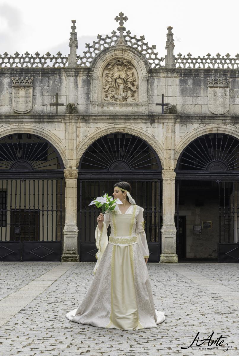 Los colores jugaban un papel muy importante pero para este traje me he tomado la licencia de usar tonos actuales, puede decirse que es medieval en cuanto a forma pero de ninguna manera ninguna dama se hubiese casado con esos colores tan pálidos más propios de las clases bajas. La moda de casarse de blanco es muy reciente.