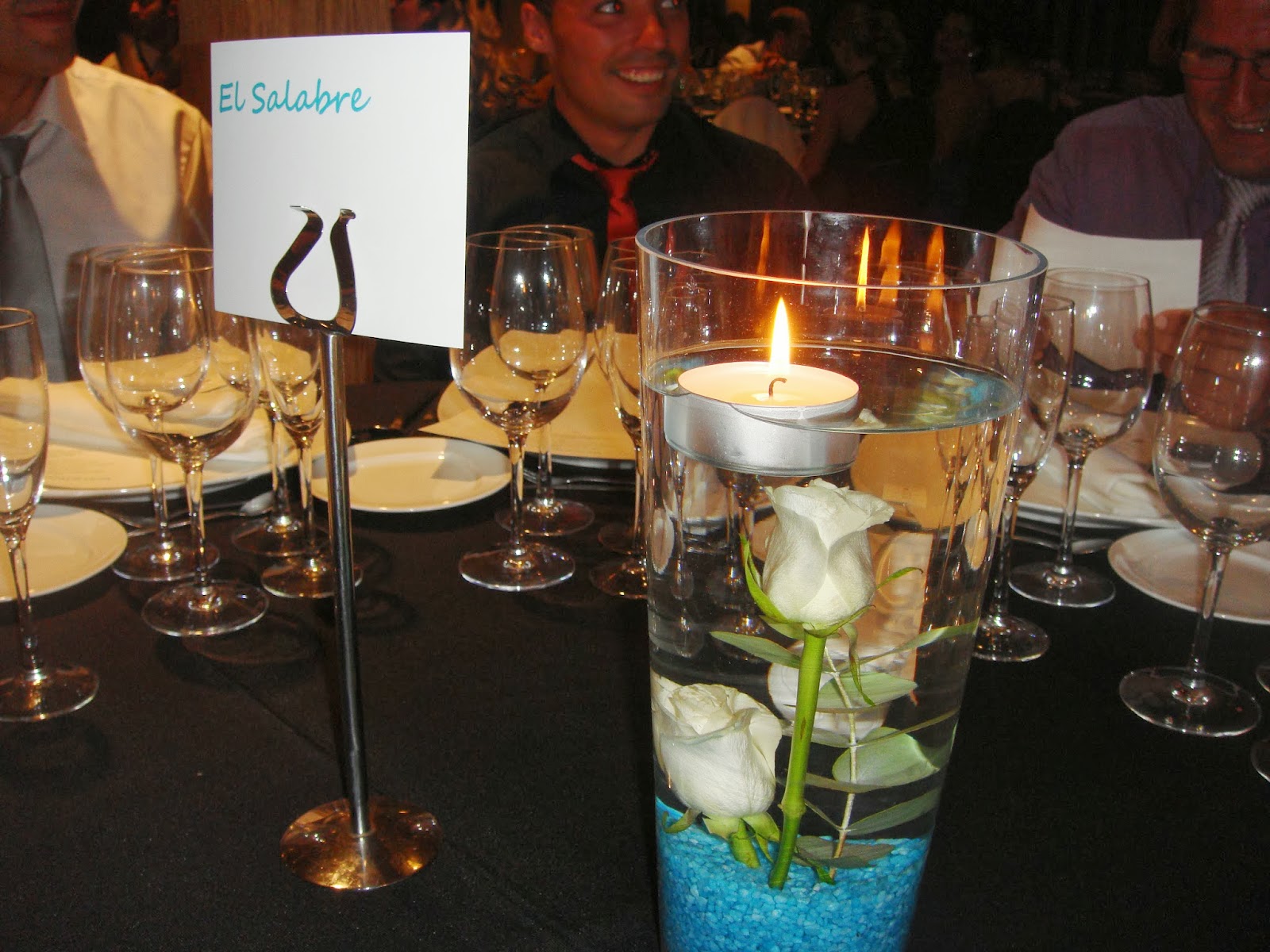 Para la ornamentación de las mesas elegimos mantelería negra, todo combinado con turquesa (mi color). Los centros los elegimos nosotros aprovechando que en el salón no entraban. Colocamos cámaras de fotos para que nuestros invitados nos hicieran partícipes de cada momento. Los meseros también eran personalizados, cada mesa tenía el nombre de algo típico de la Albufera (el ullal, la restinga, el salabre...) Colocamos tarjetas personales en cada plato y la minuta también iba acorde a los colores que utilizamos.