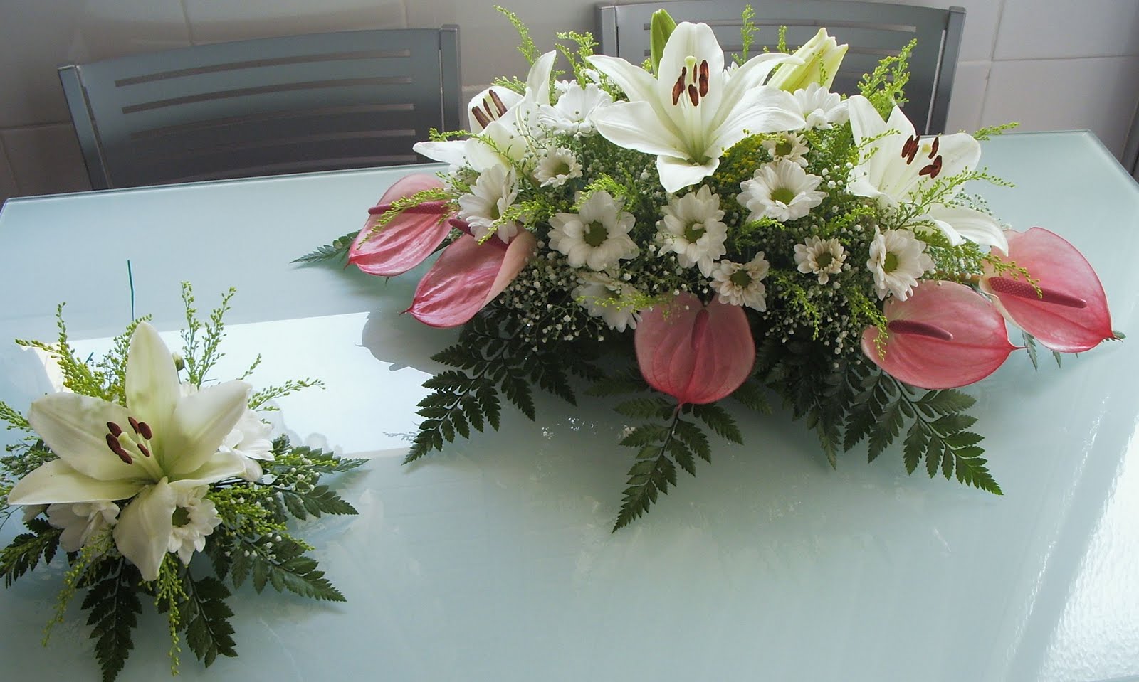 Para los coches le hice este centro para la parte de atrás con margaritas y lilium en blanco y mini-anturium rosa. Unos minicentros con margaritas y lilium para las puertas del coche.
