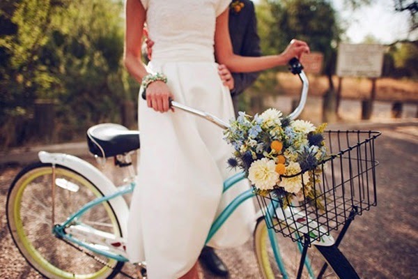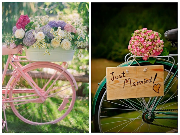 Bicicletas con flores: Seguro que tenéis alguna del año cata pum en el trastero. Pues es hora de quitarle el polvo y darle otro aire. De hierro forjado, con canastos de mimbre o cubos de latón, con flores silvestres o de temporada? las posibilidades para decorar vuestro rincón favorito con una bonita bici son infinitas. Según la temática de vuestra boda, también podéis incluir algún globoo colgar unas cintas de colores del manillar.