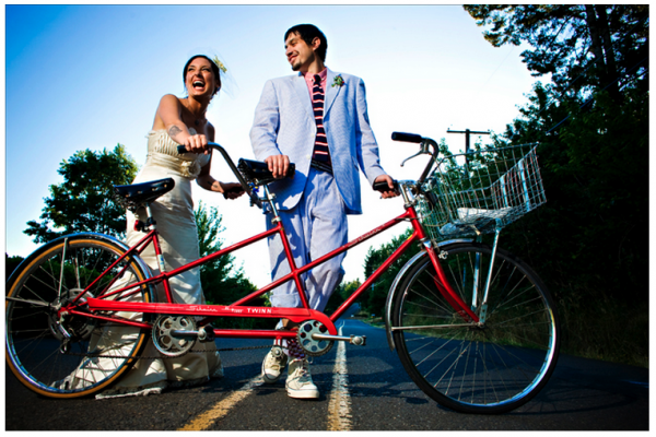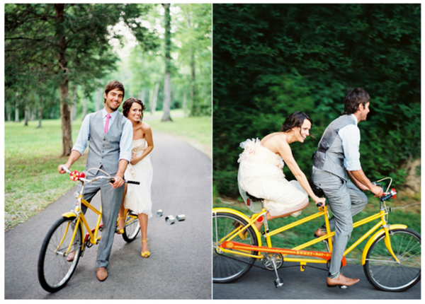 Bicicletas como medio de transporte: Otra opción muy original y sobretodo ecológicaes llegar a vuestra boda en una bicicletao tándem. Lo más práctico es usar un vestido corto para evitar que se te ensucie y puedas pedalear sin tropiezos. Presta especial atención a los tacones, estos no deben ser muy altos, de lo contrario sería mucho más difícil pedalear y puedes correr el riesgo de caerte.
