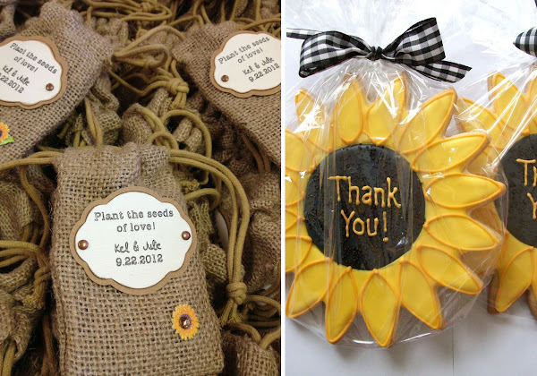 Y para el detalle para los invitados que tantos quebraderos de cabeza suele dar ¡hemos encontrado dos ideas! Si sois tirando a románticos podéis entregar una bolsita con semillas pidiéndoles que planten las semillas de vuestro amor... Vale, puede que el mensaje así leído quede un poco ñoño, pero viéndolo en la bolsita queda taaaan bonito ¿verdad? Y si sois tirando a golosos podéis entregar unas ricas galletas en forma de girasol. Las que hemos encontrado tienen una pinta espectacular...