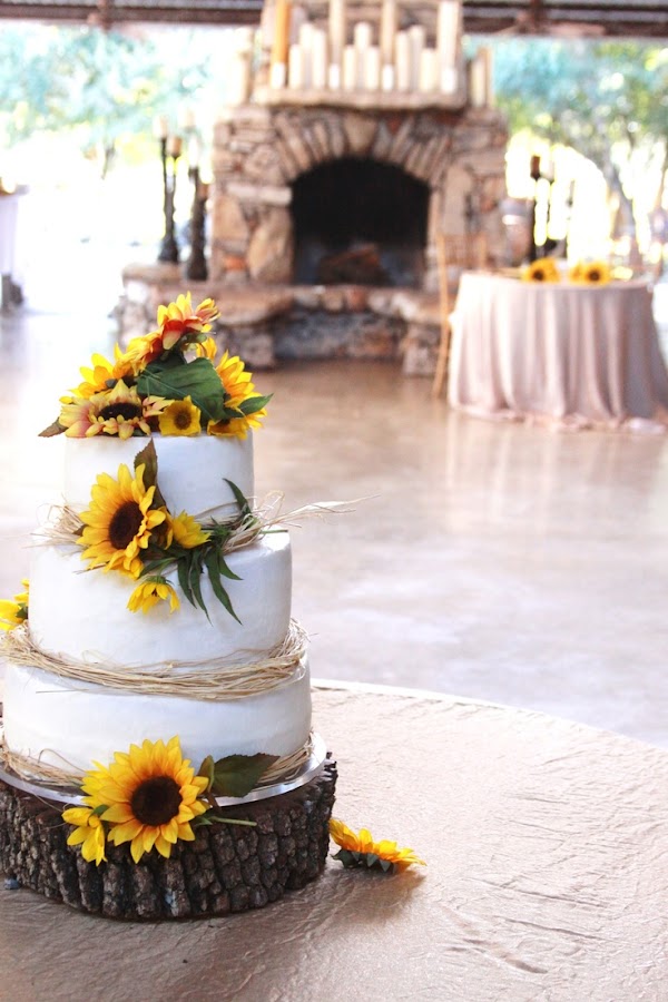 No nos podemos olvidar de la tarta, por que también la podemos decorar con girasoles. Y si no mirad esta que os traemos cubierta con fondant y decorada con unos cuantos girasoles, hojas y rafia...