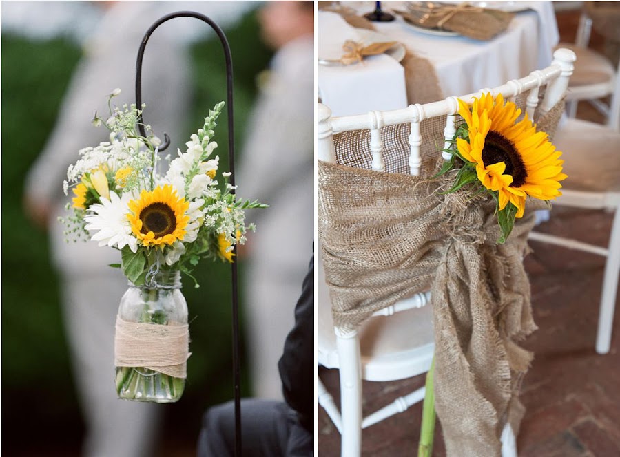En la decoración de la ceremonia o del banquete también podemos incluir algunos girasoles, aunque aquí deberíamos seguir la norma de "menos es más" si no queremos acabar como si estuviéramos metidos en un campo de girasoles. Unos tarros con una combinación de varias flores de camino al altar o decorando algunas sillas puede ser el toque ideal para nuestra boda con aire campestre.