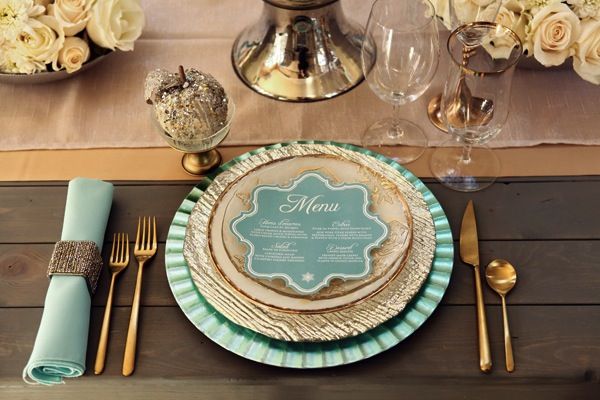 En mi opinión no es una buena idea tenerlo todo dorado, sería como muy recargado. Es mejor incorporarlo en detalles simples, ya sea en complementos de los novios, en algunos elementos decorativos o en el menú.