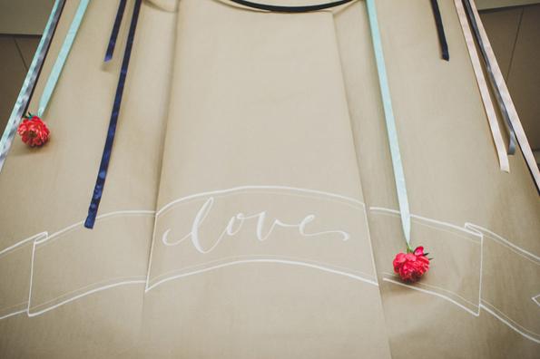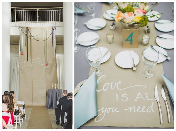 Esta decoración de boda que os muestro ha utilizado este material de una forma muy inteligente, sirviendo de lienzo para mensajes de amor eterno (tema de la boda) y cubriendo grandes espacios diáfanos (la boda se celebraba en un museo) con rollos de este papel colgados y dejados caer hasta el suelo, a modo de grandes banderolas. ¡Tomad nota, un backdrop para la ceremonia super bonito y baratisimo!.