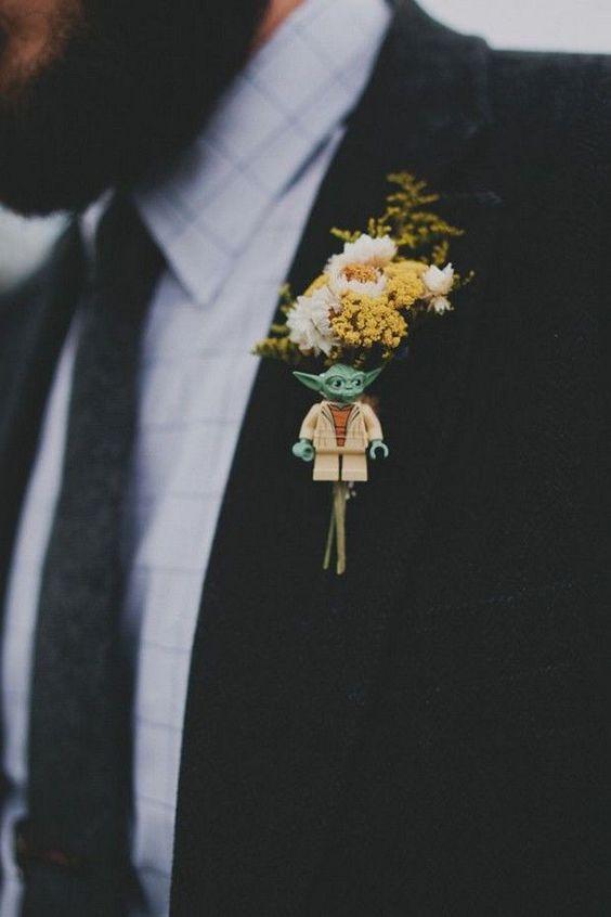 En este caso dos de las piezas principales en el estilimo de los novios, el prendido y el ramo de novia.Por un lado, en el primer de los casos el prendido va acompañado por una ingeniosa figura de Yoda. Mientras que en el segundo de los casos, el ramo de novia lleva una empuñadura muy original en forma de espadas láser.