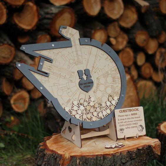 Una idea original dónde las haya y que guarda una de las piezas más preciadas en una boda, las alianzas. Símbolo para sellar la unión entre la pareja.Meseros personalizados sobre star wars