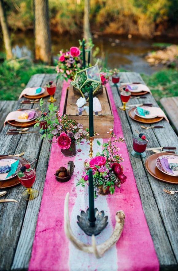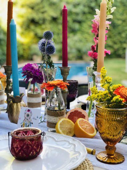 Dejarás a todos con la boca abierta en una mesa decorada al estilo Boho. Utiliza recipientes de cristal con jarrones y botellas, velas y flores en tus centros de mesa.