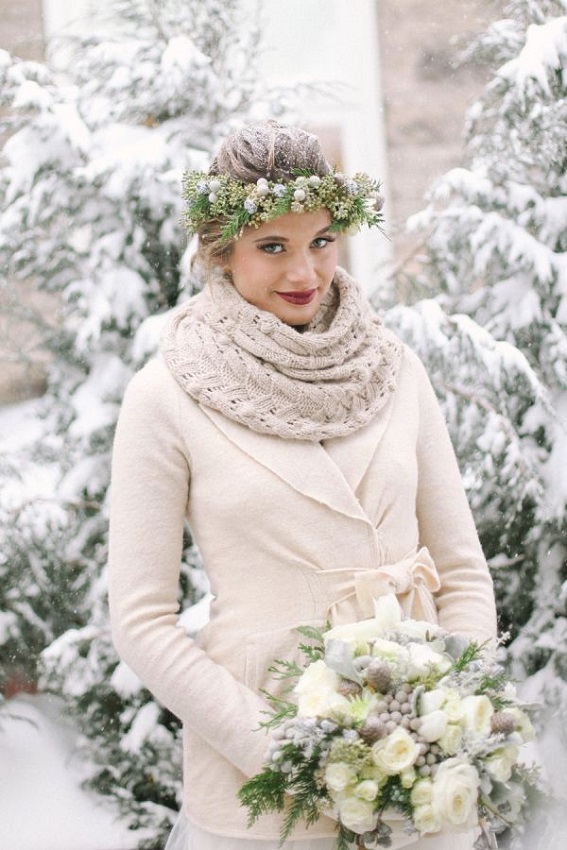 Si vuestra boda fue (o será) en primavera diras quien se pone el vestido de palabra de honor con el frio que hace pues no te preocupes, que tenemos soluciones para todas, ponte una chaqueta de lana y un cuello bien calentito, así le darás otro toque especial a tu traje, si prefieres ponte una cazadora de cuero como te recomendamos en este otro post.
