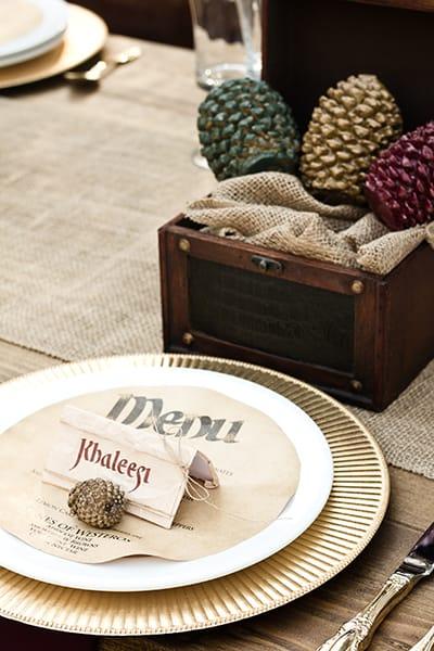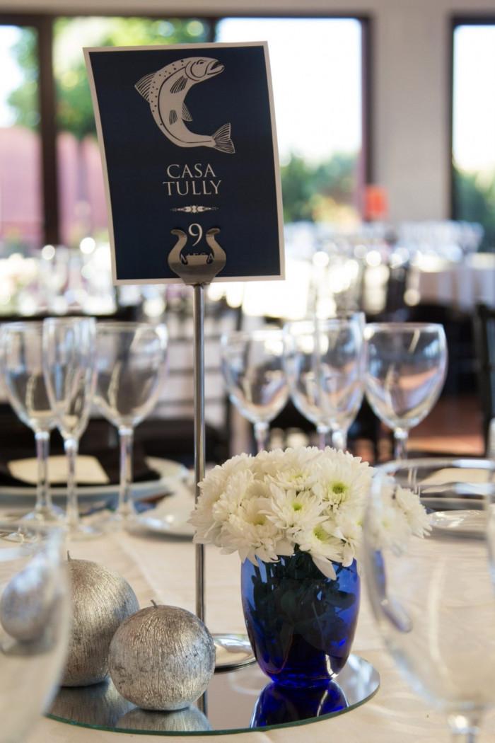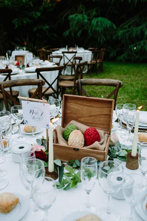 Como centros de mesas destacan los tres huevos de dragón con una original presentación, en una cajita de madera. Otro detalle divertido es nombrar las mesas con los 7 reinos de la serie.